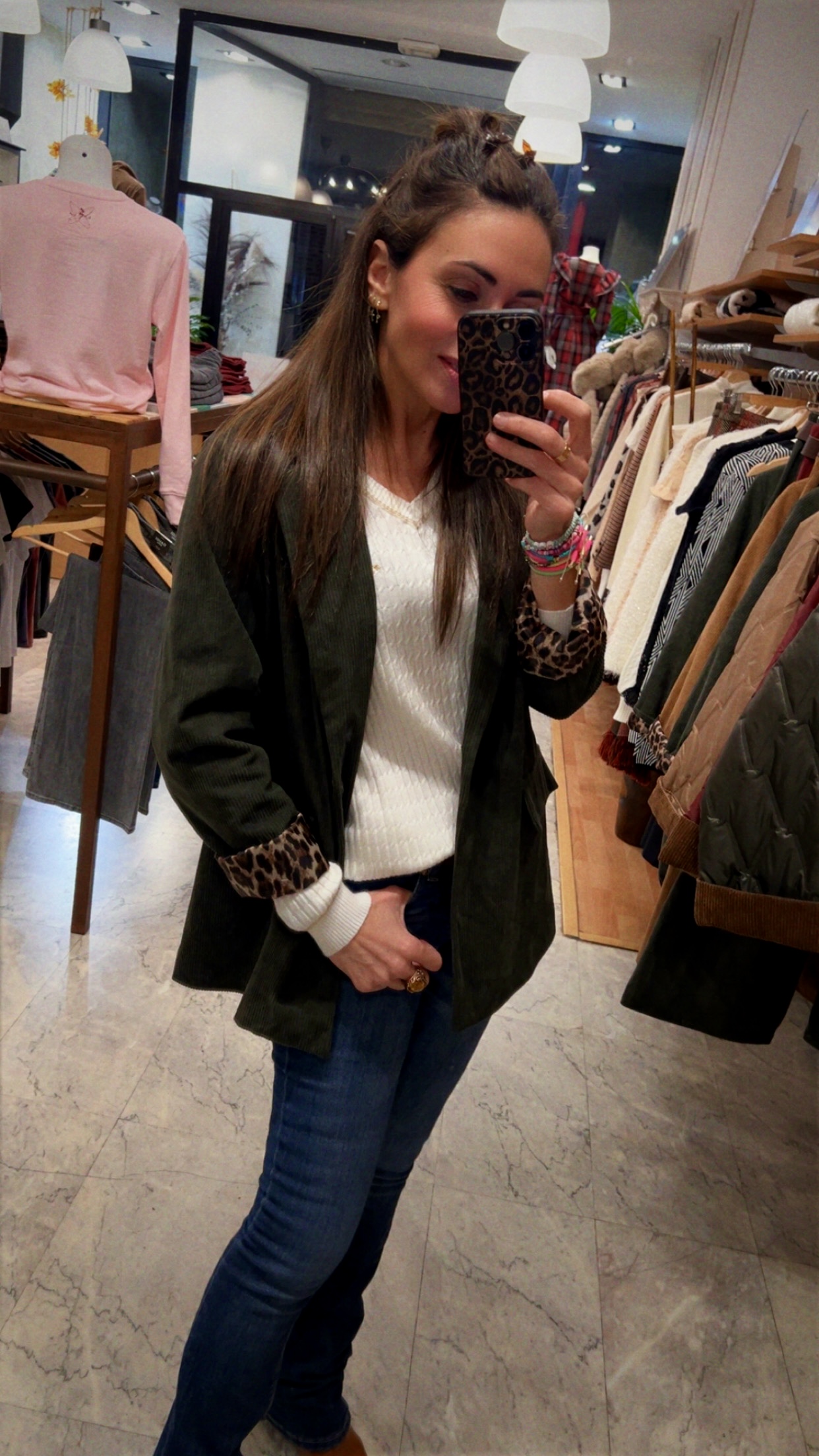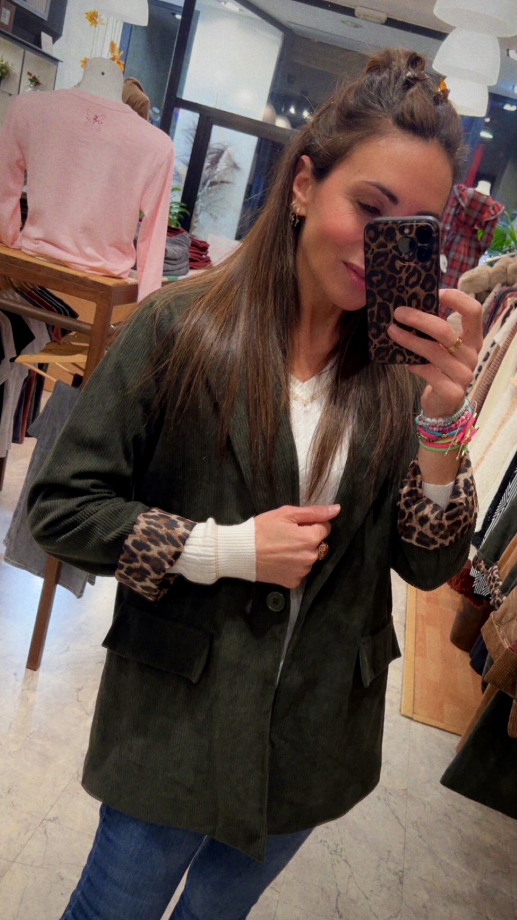 Blazer de corte recto estilo «casual» en tono verde musgo. Confeccionada en micropana con solapas , bolsillos de tapeta y forro con estampado de leopardo.