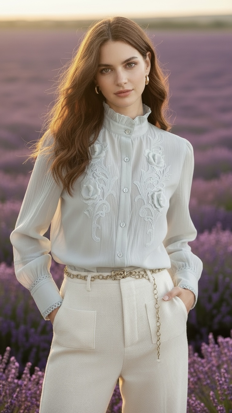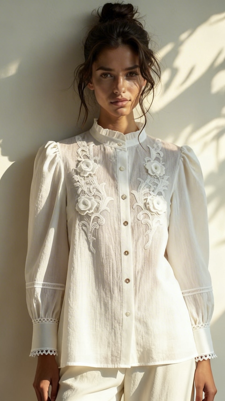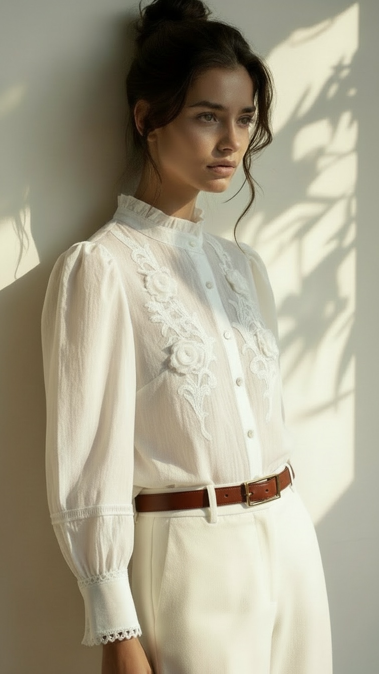 Blusa blanca de corte camisero. Modelo con cuello romántico rematado con pequeño volantito y aplicaciones de encaje con flores al tono en pecho. Diseñada con manga larga y puños con doble botón rematados con puntilla.
