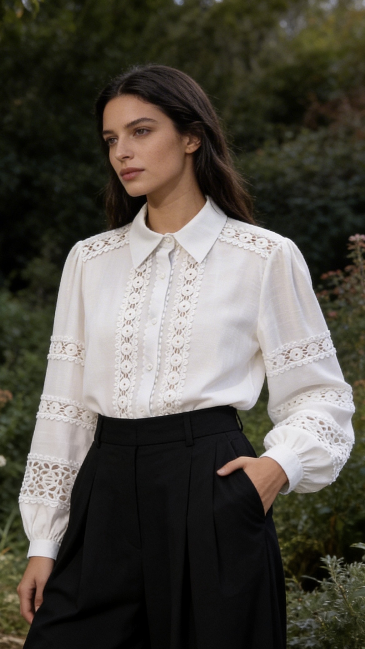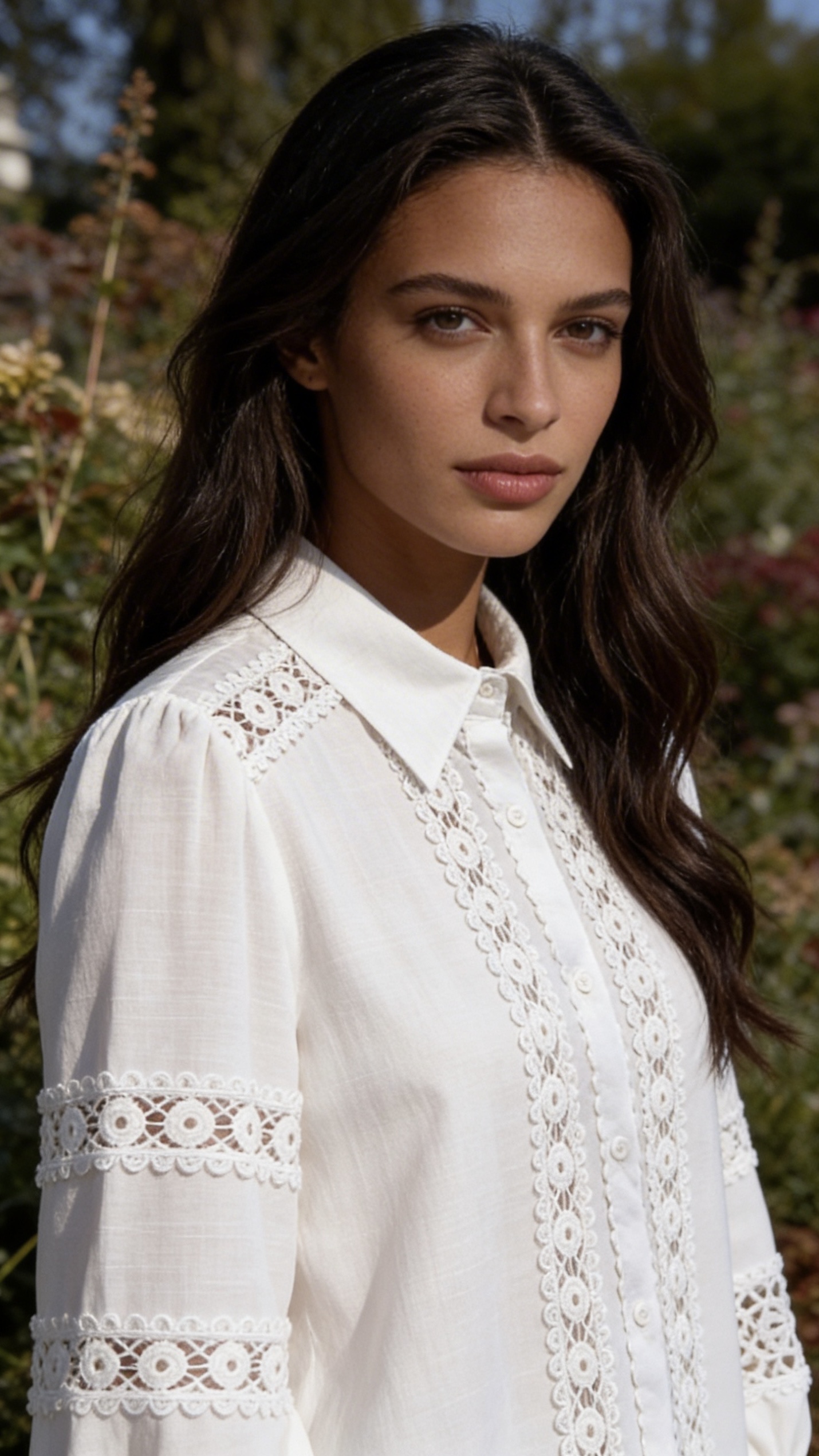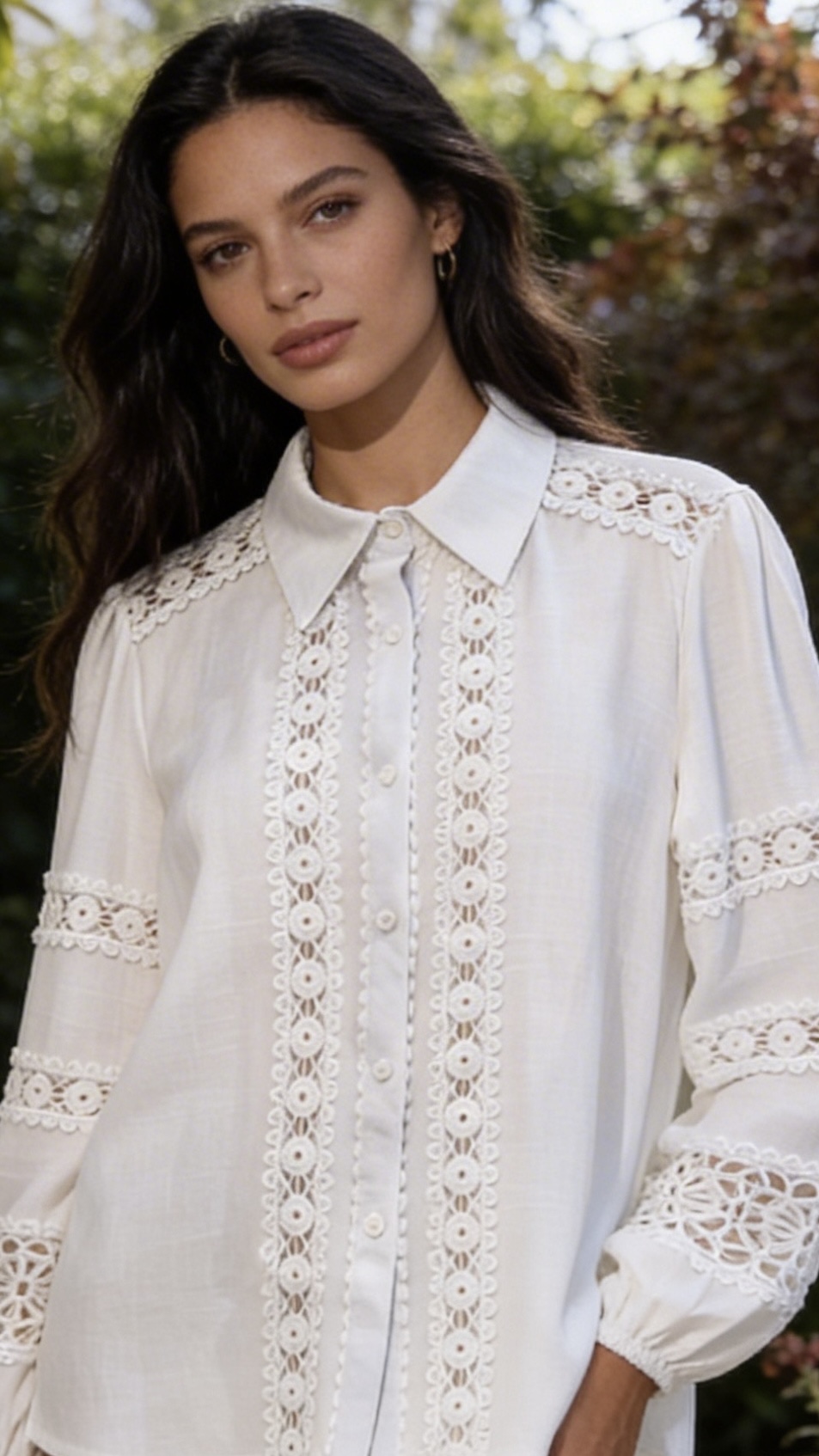 Blusa blanca de corte camisero con goma en los puños de las mangas. Modelo diseñado con piezas brocadas de algodón en pecho y mangas.