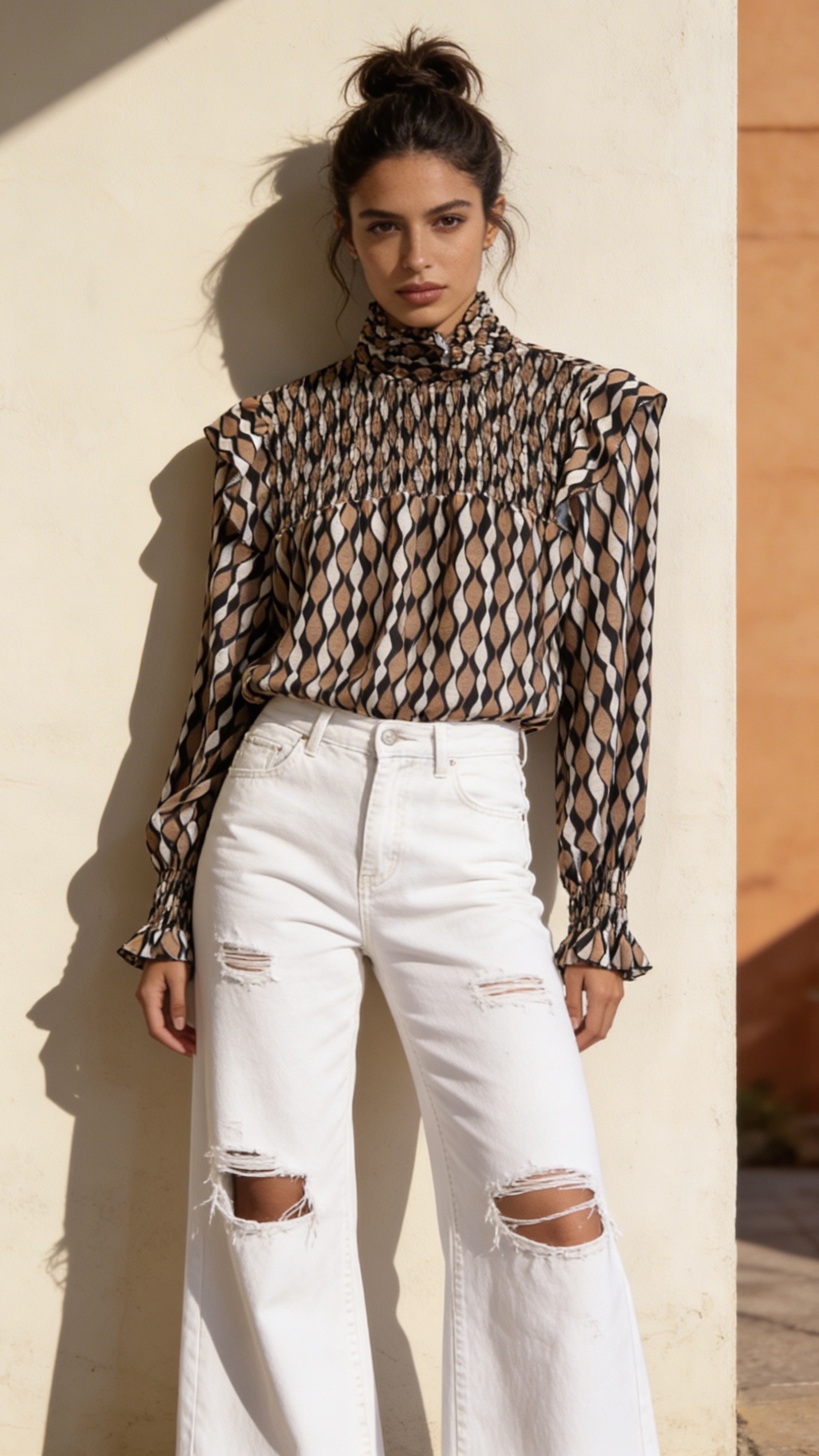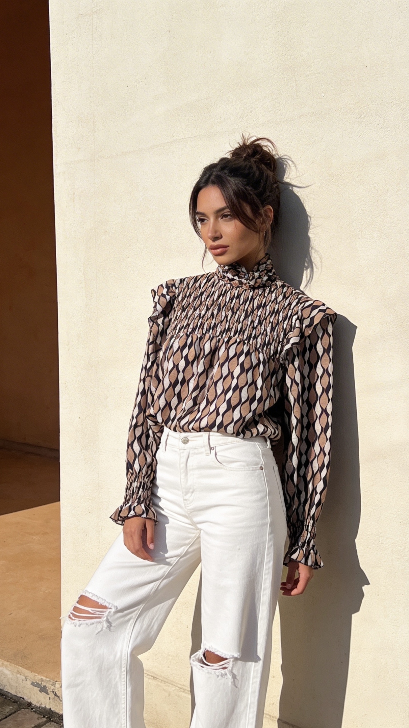 Blusa de corte imperio con la parte superior en nido de abeja y faldón con vuelo en combinación de tonos negro y camel. Modelo diseñado con manga francesa y puño con volante y nido de abeja también.