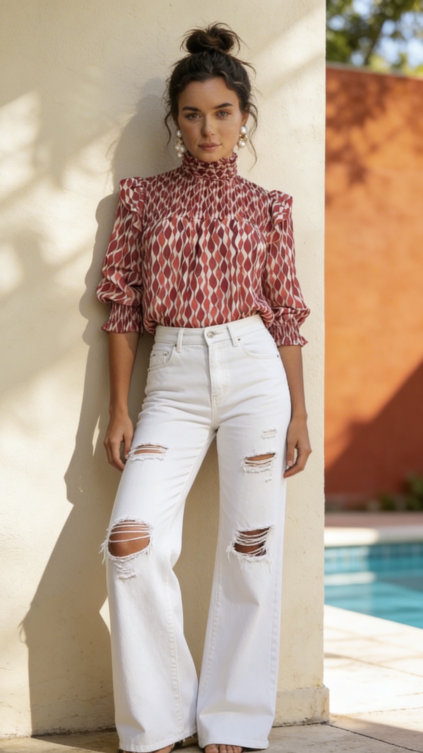 Blusa de corte imperio con la parte superior en nido de abeja y faldón con vuelo en combinación de tonos rojo cereza y beig. Modelo diseñado con manga francesa y puño con volante y nido de abeja también.