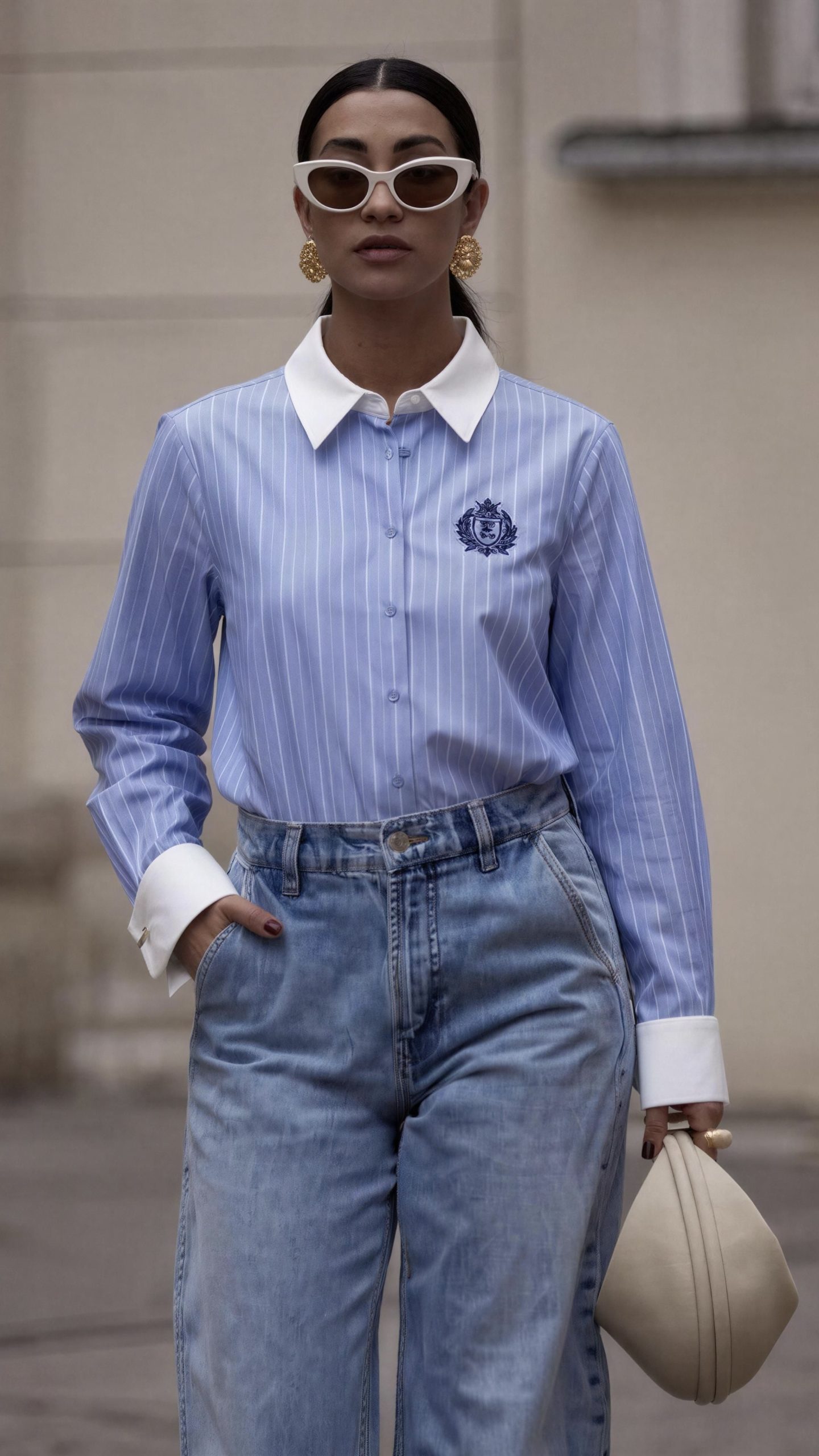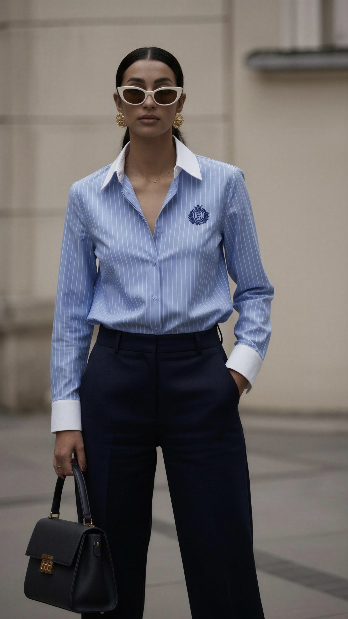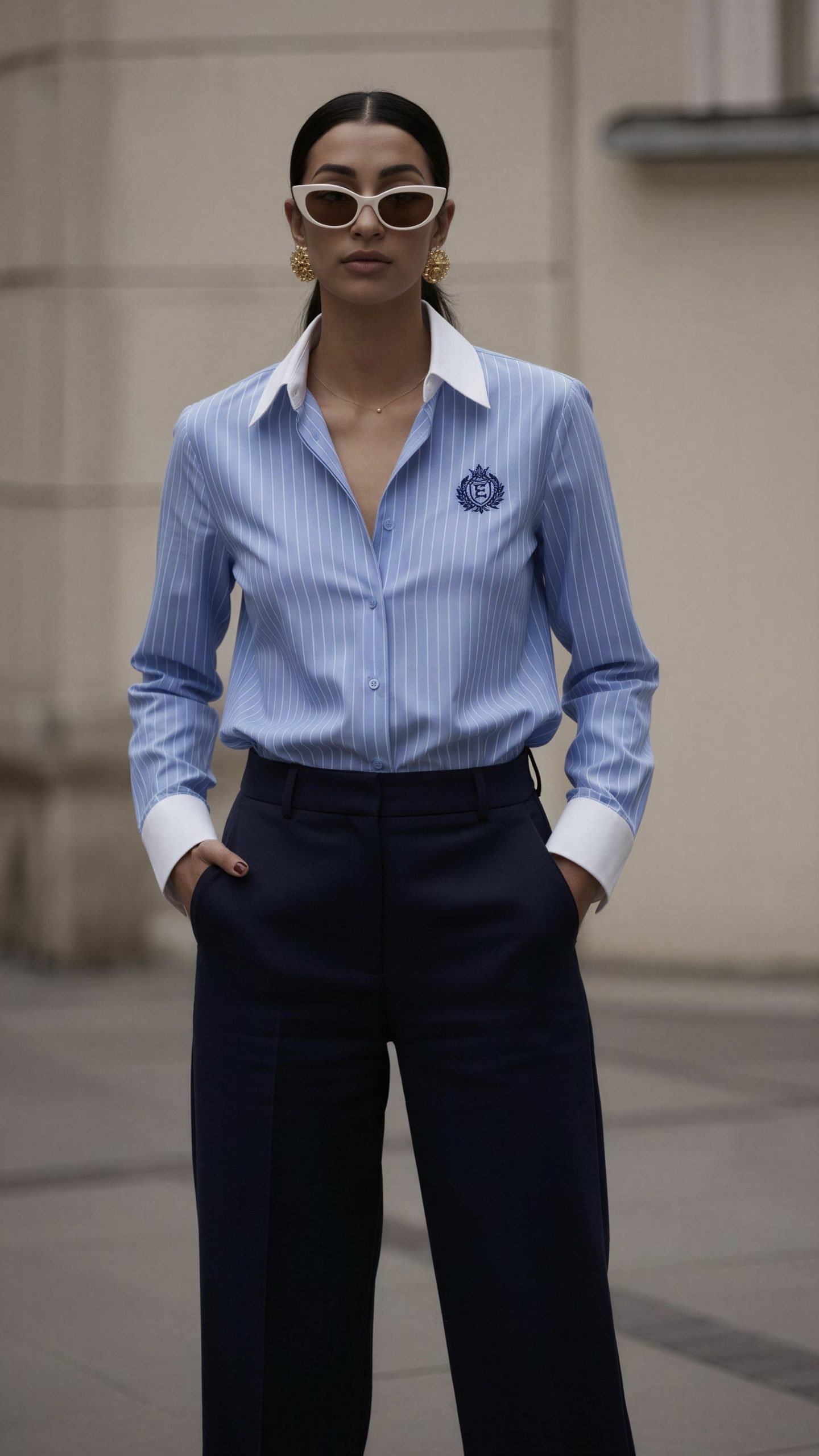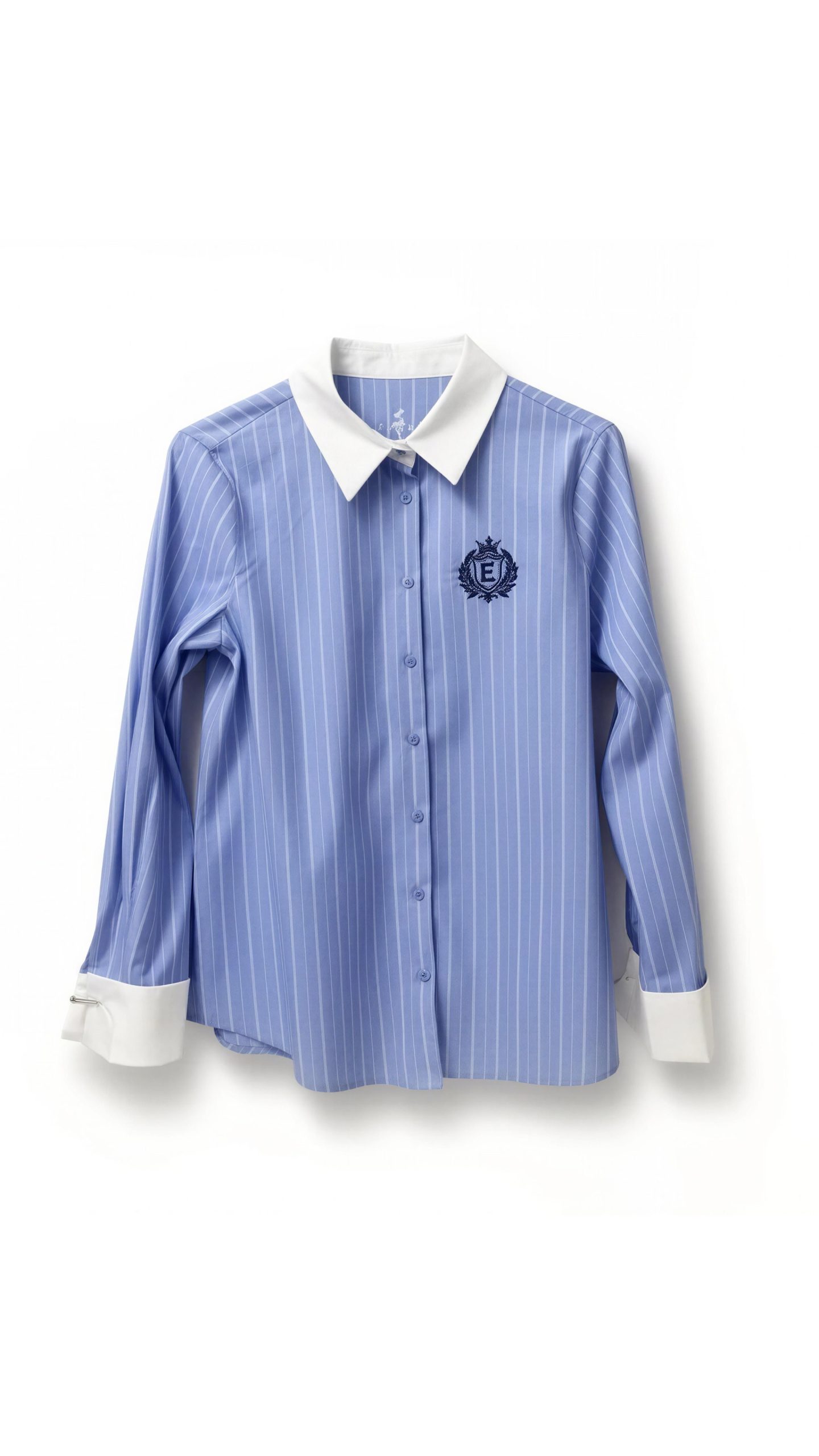 Camisa rayas azul y blanca de la marca ENOLA SPIRIT. Modelo de corte recto con cuello blanco y puños dobles para gemelos en blanco también. Bordada en pecho izquierdo en azul marino con el escudo de la marca.