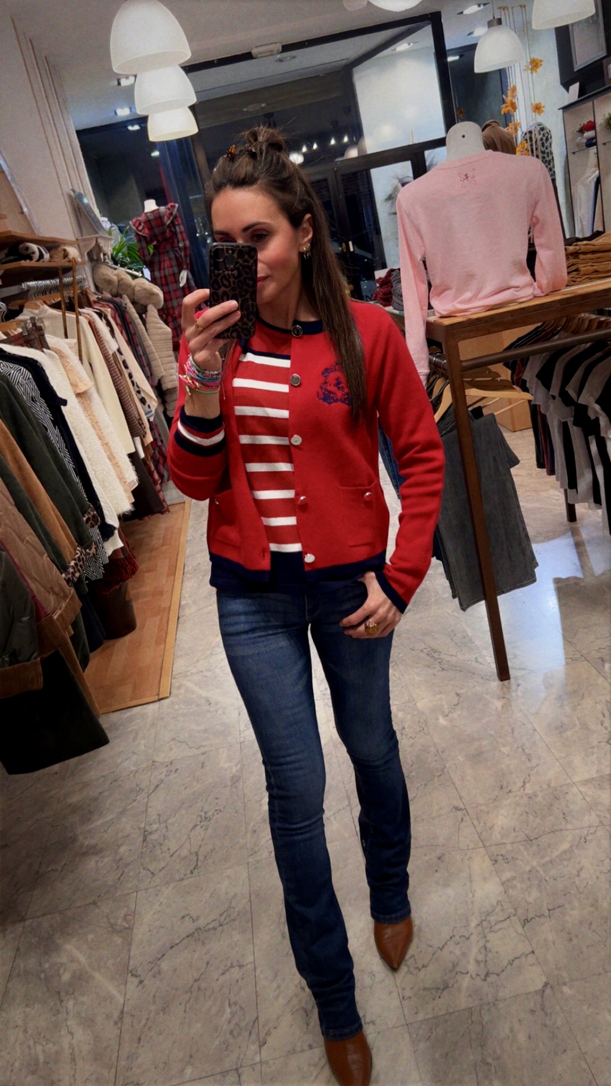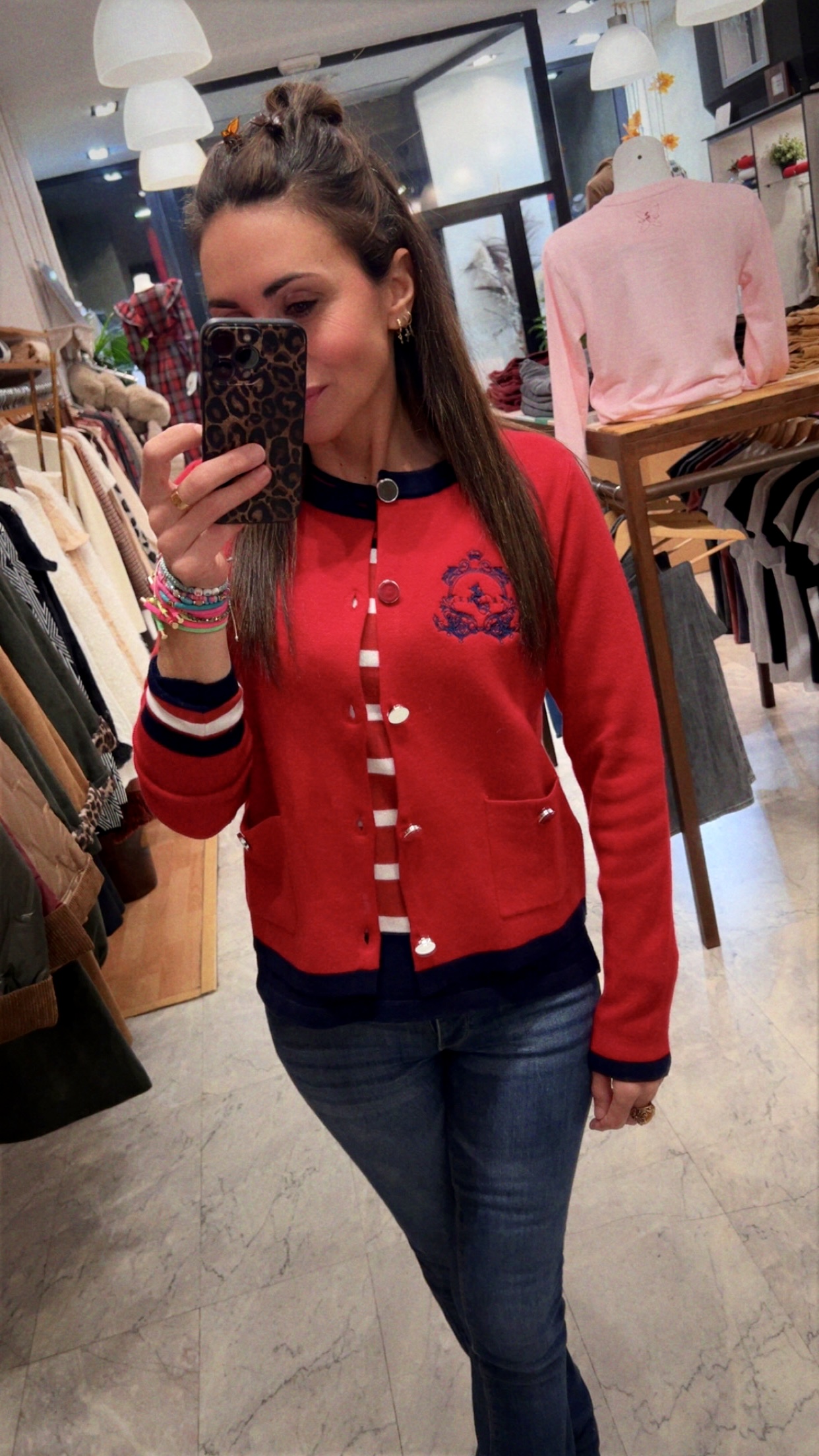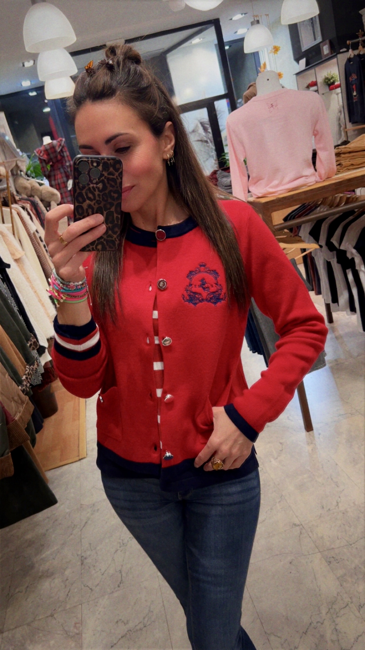 Cárdigan de punto en tono rojo con corte estilo chanel. Modelo diseñado con bolsillos y botonadura plateada y con ribetes en cuello , puños y bajo en color azul marino. Dale un toque de sofisticación a tus looks y crea outfits de estilo navy que serán tus mejores aliados.