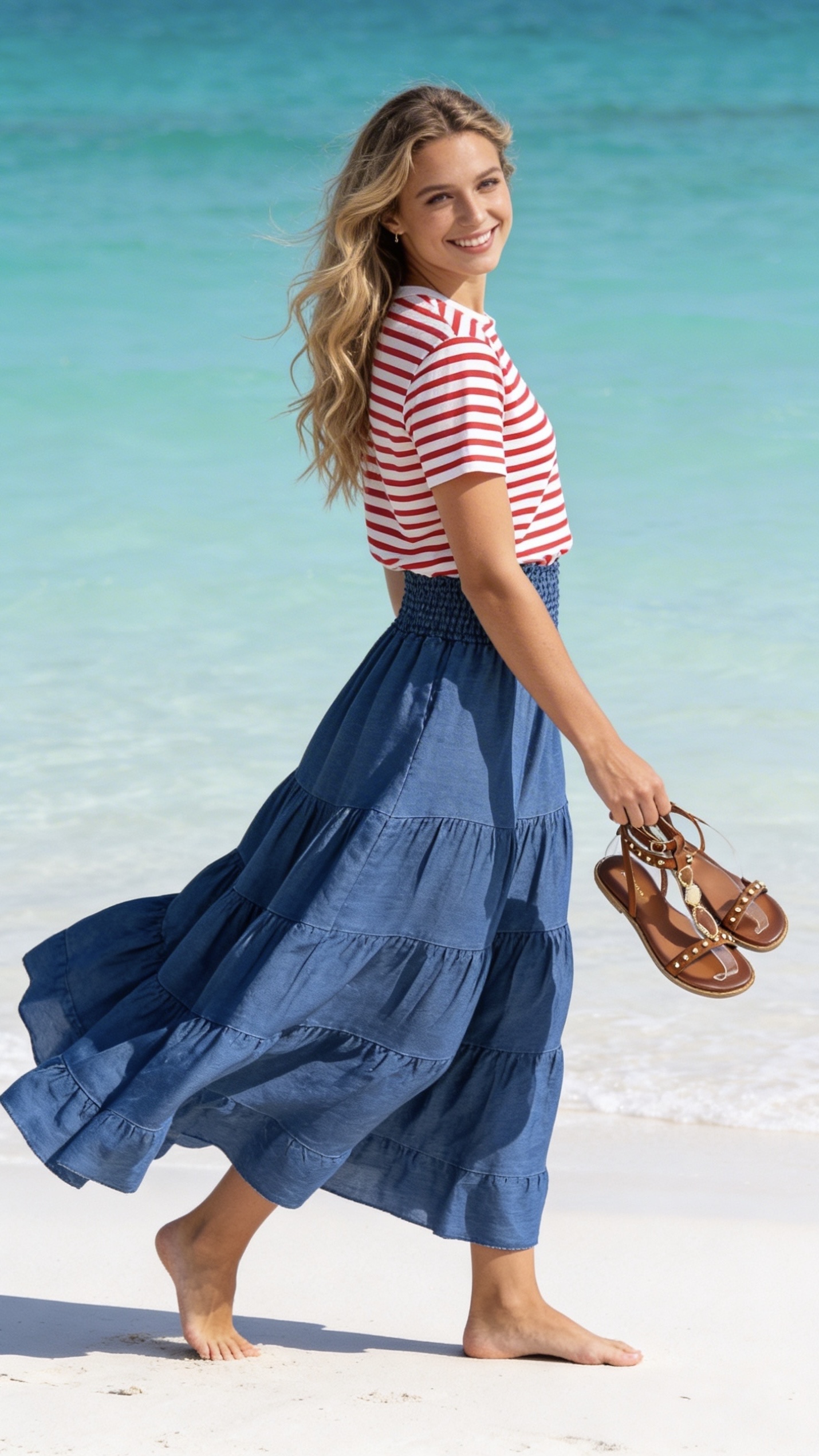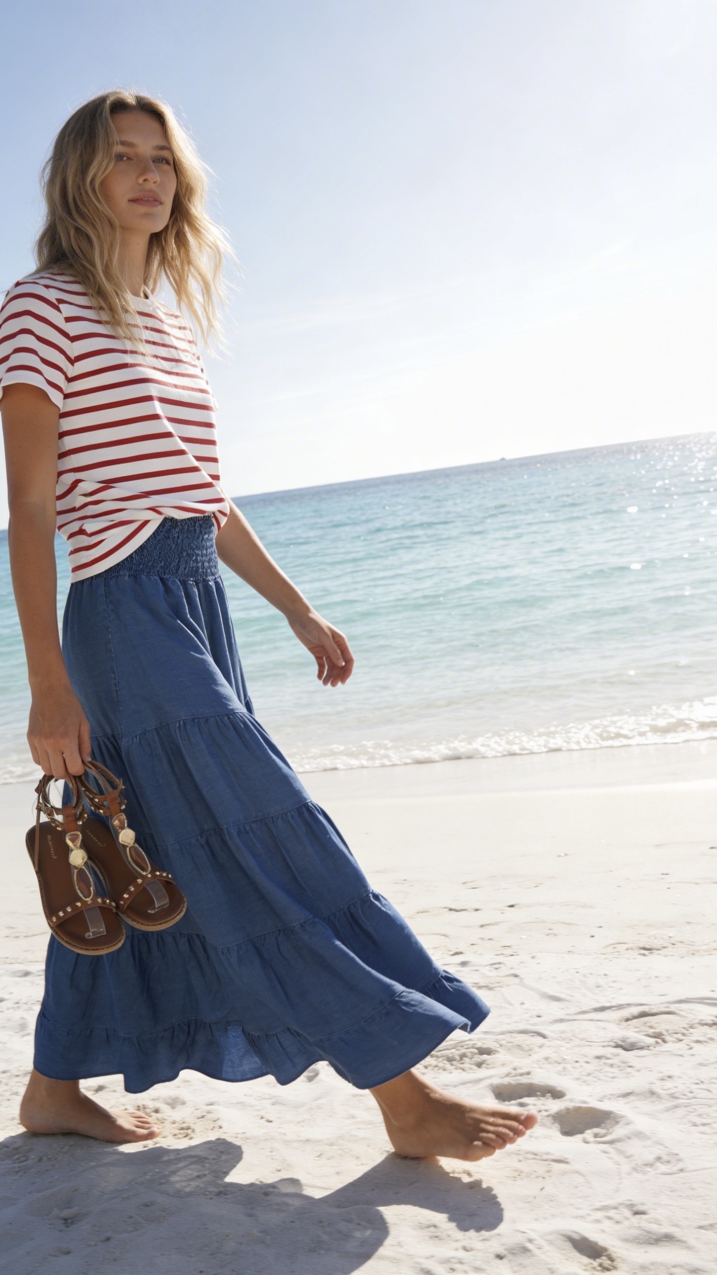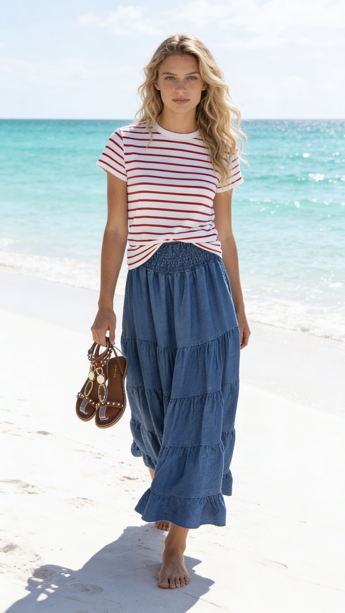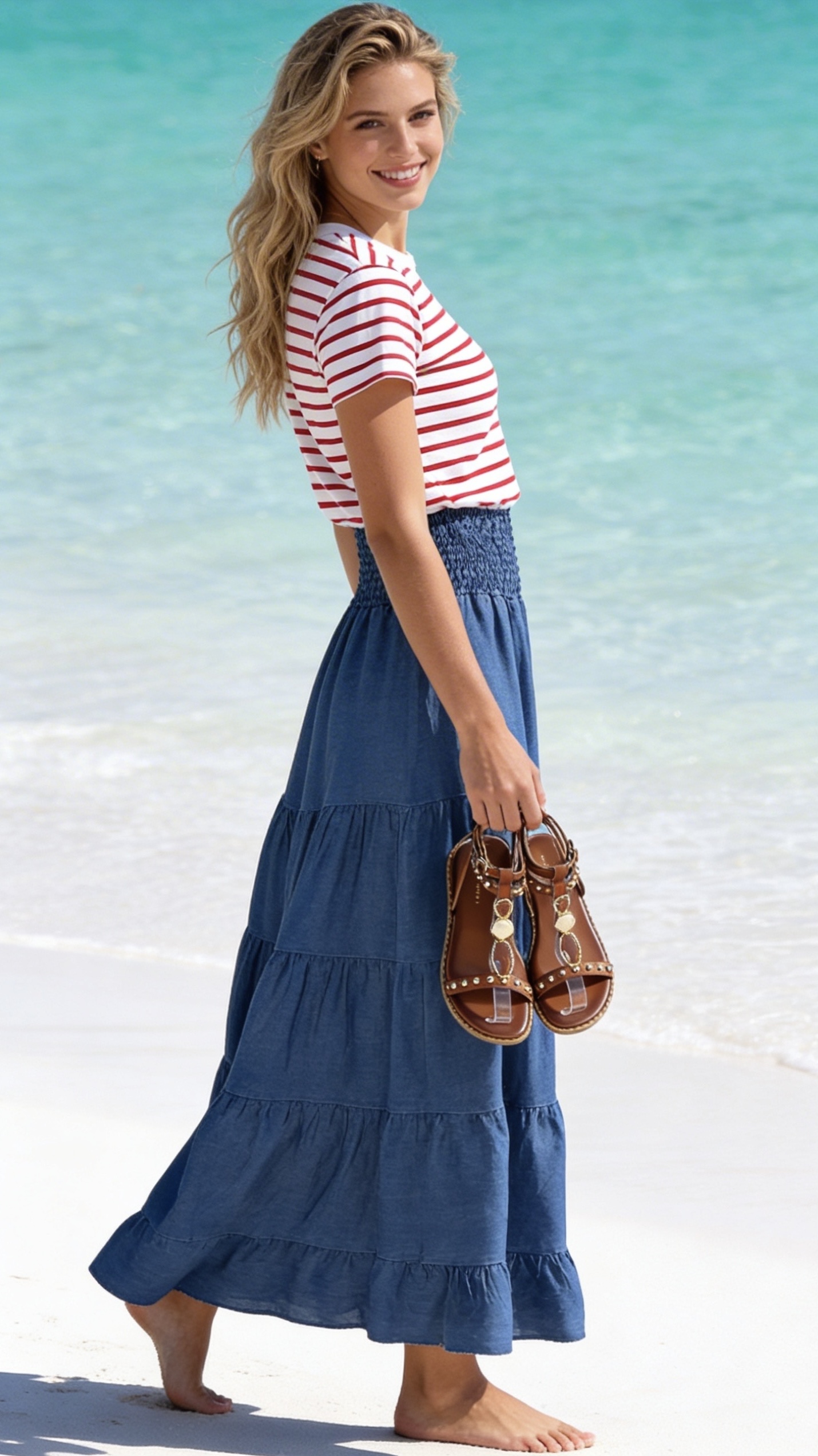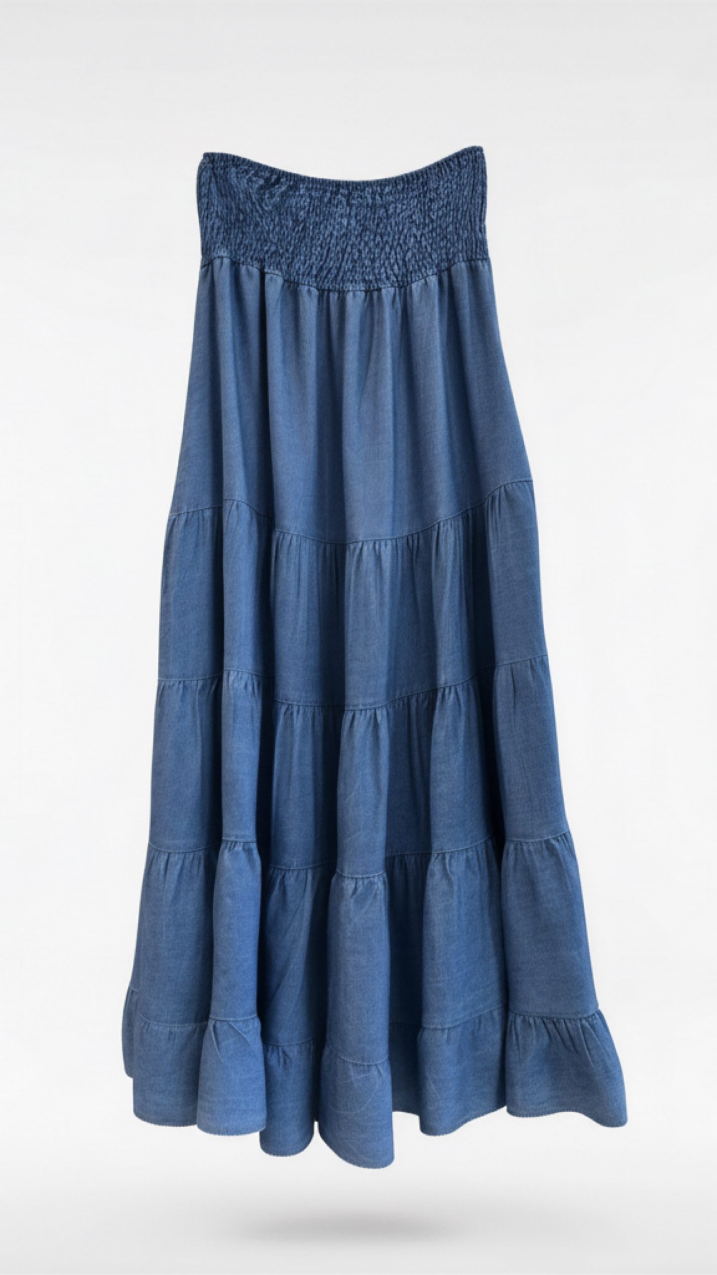 Falda larga en tejido denim tencel. Modelo con cintura ancha en nido de abeja y corte con pisos en vuelo.