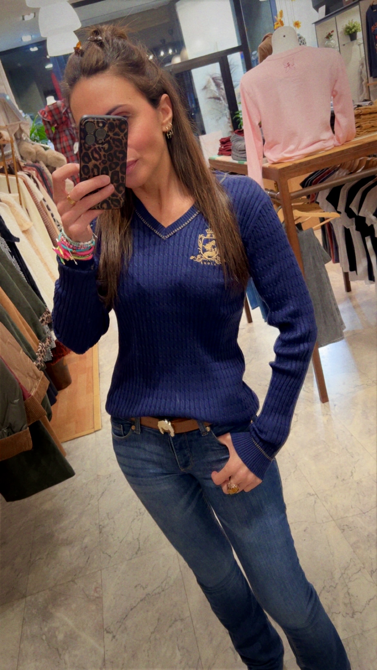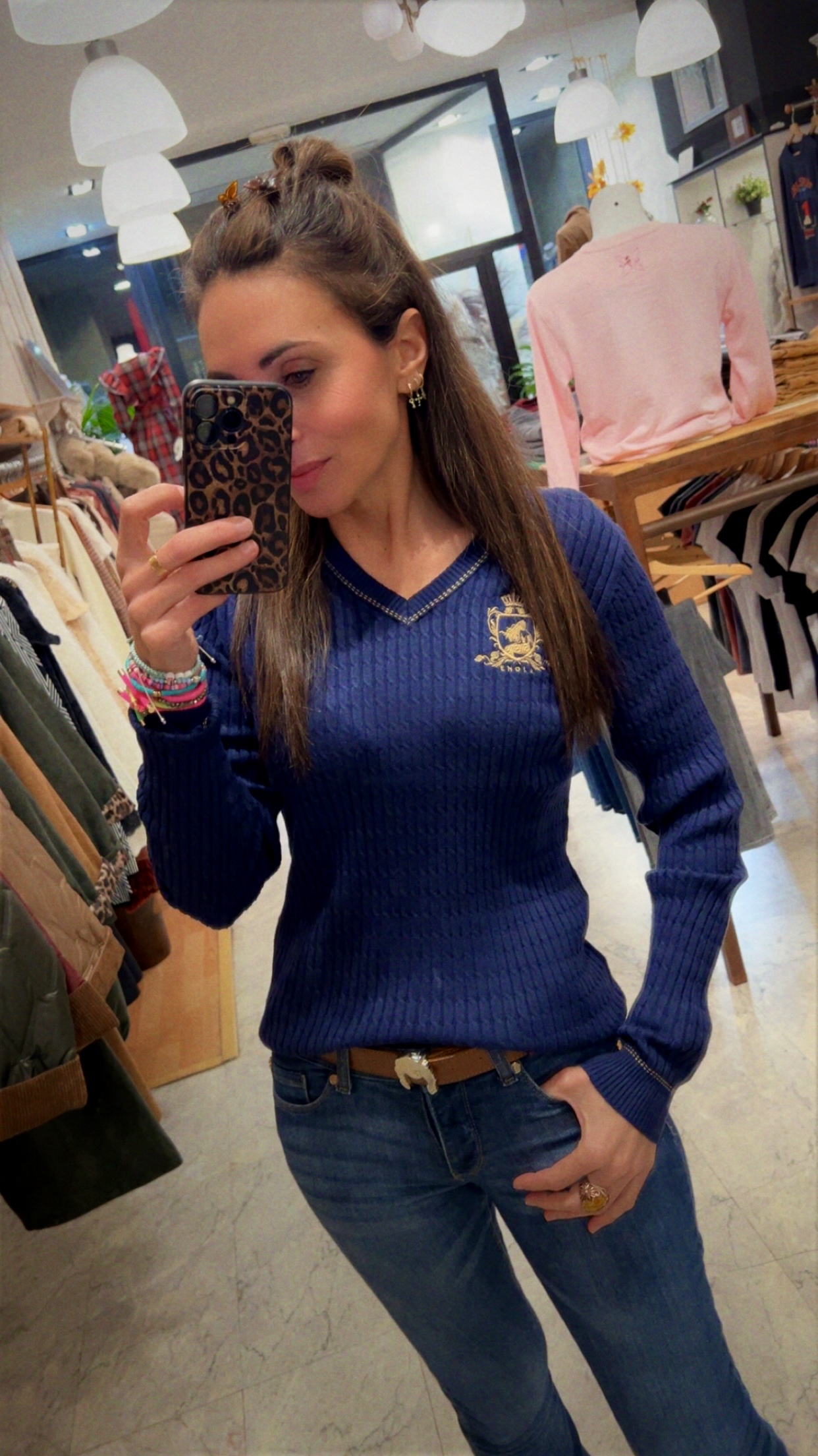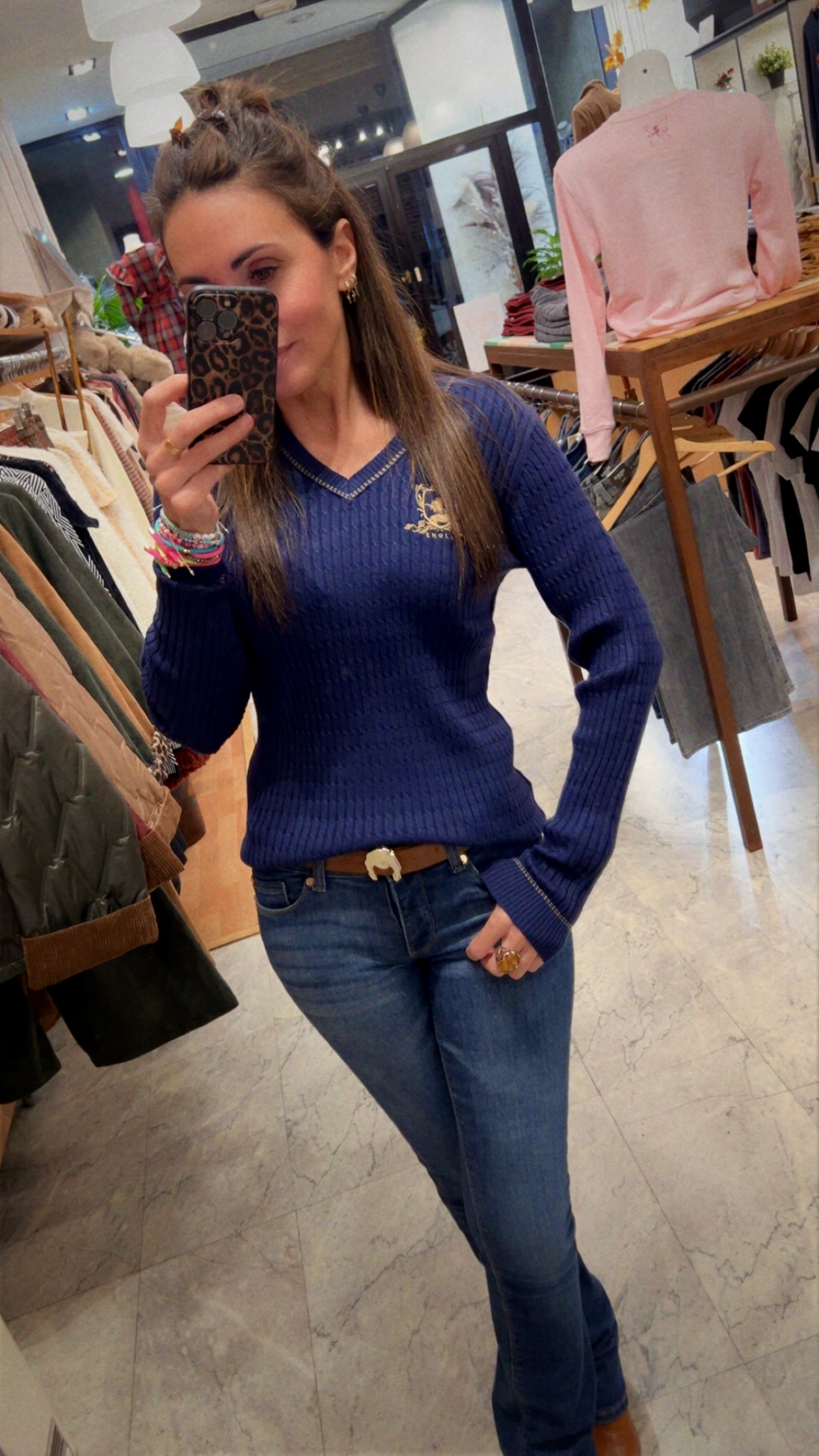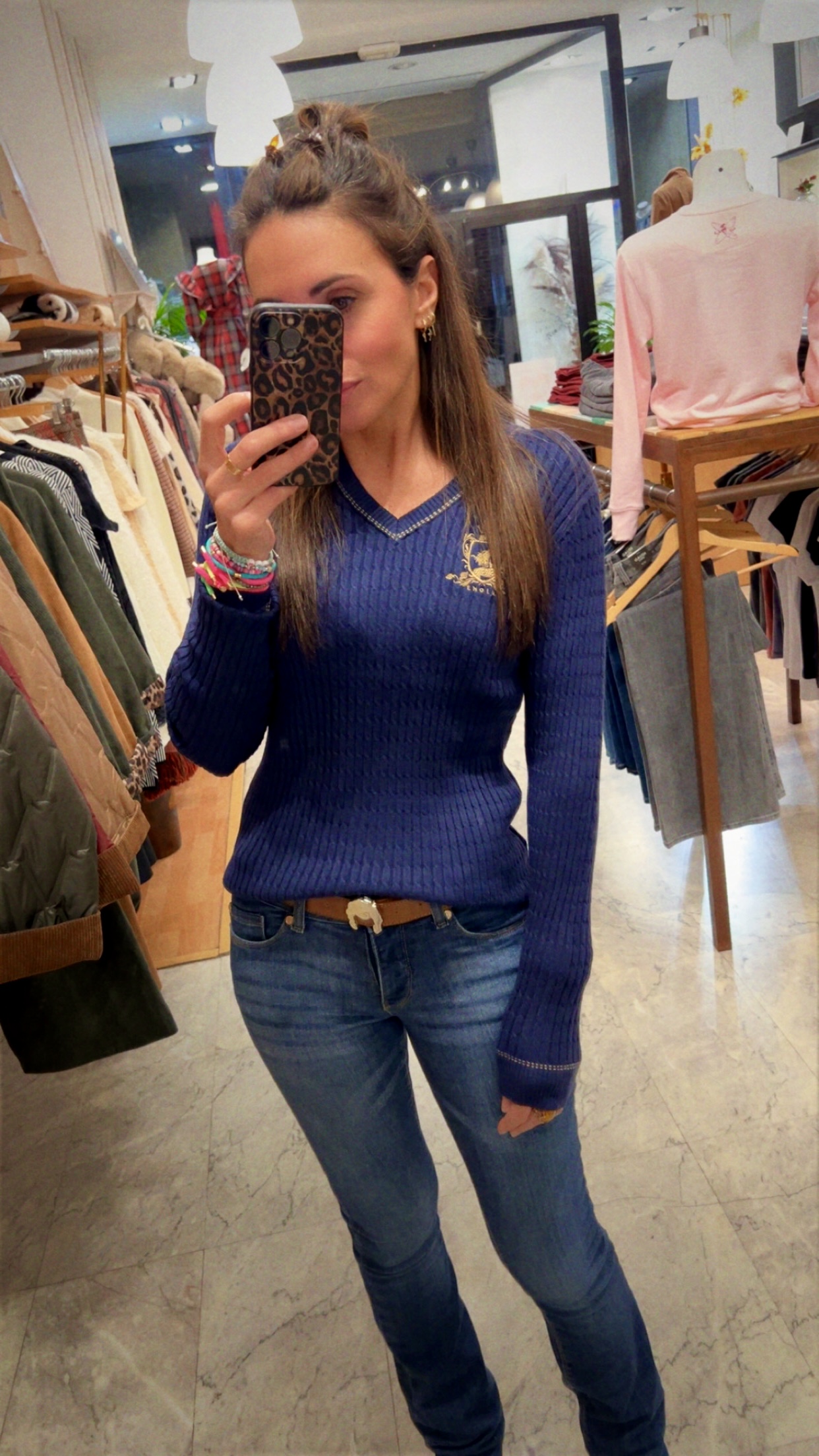 Jersey de punto en tono rojo con escote en pico y bordado luxury de la marca ENOLA SPIRIT. Modelo con ribete en tono camel al tono del bordado.