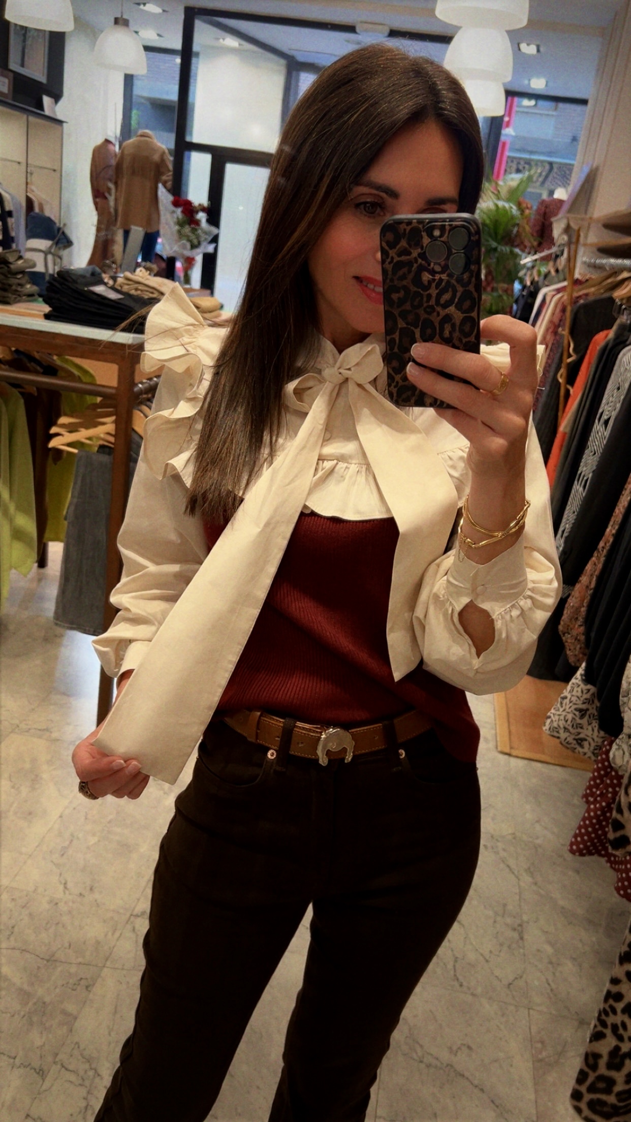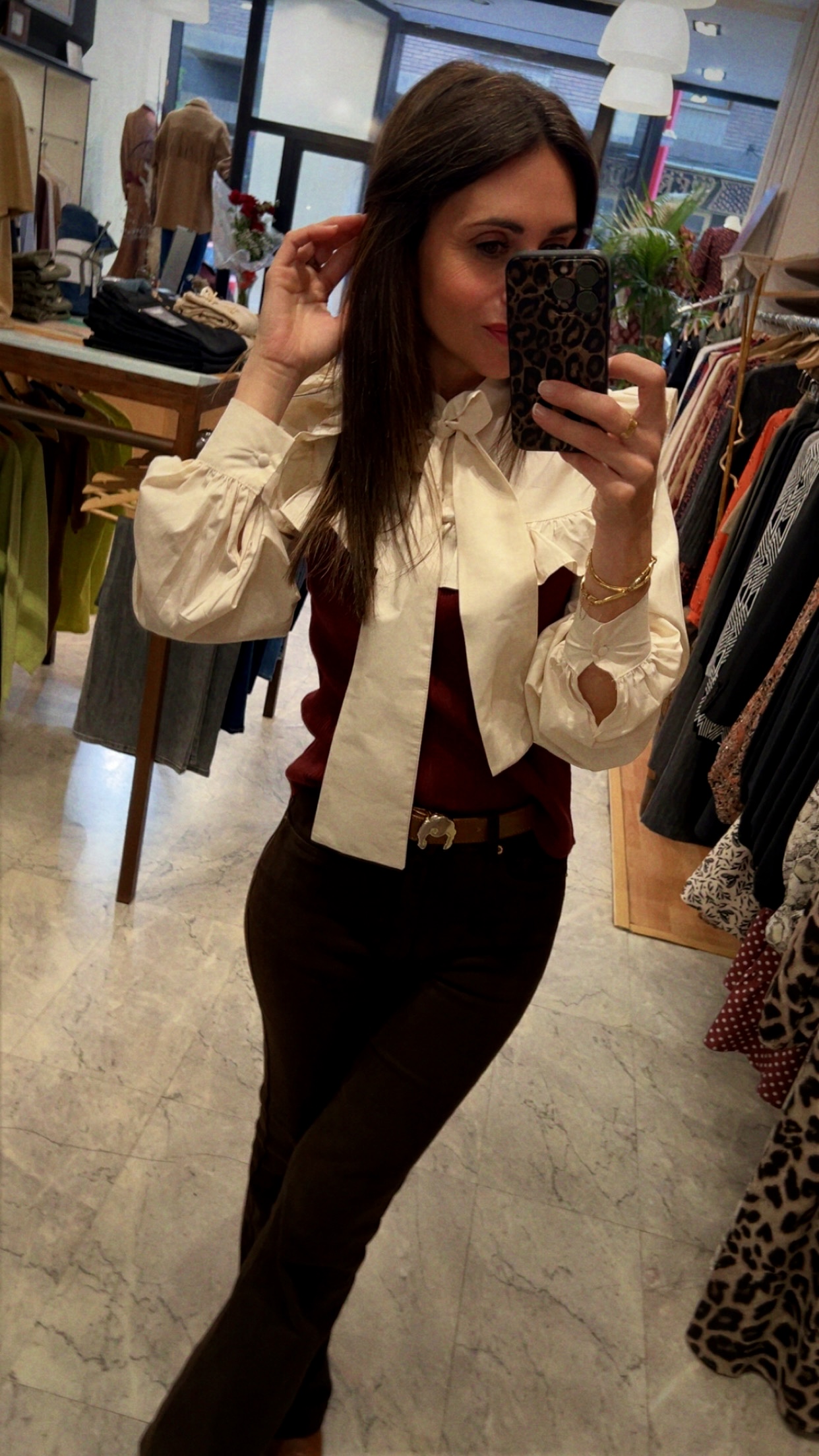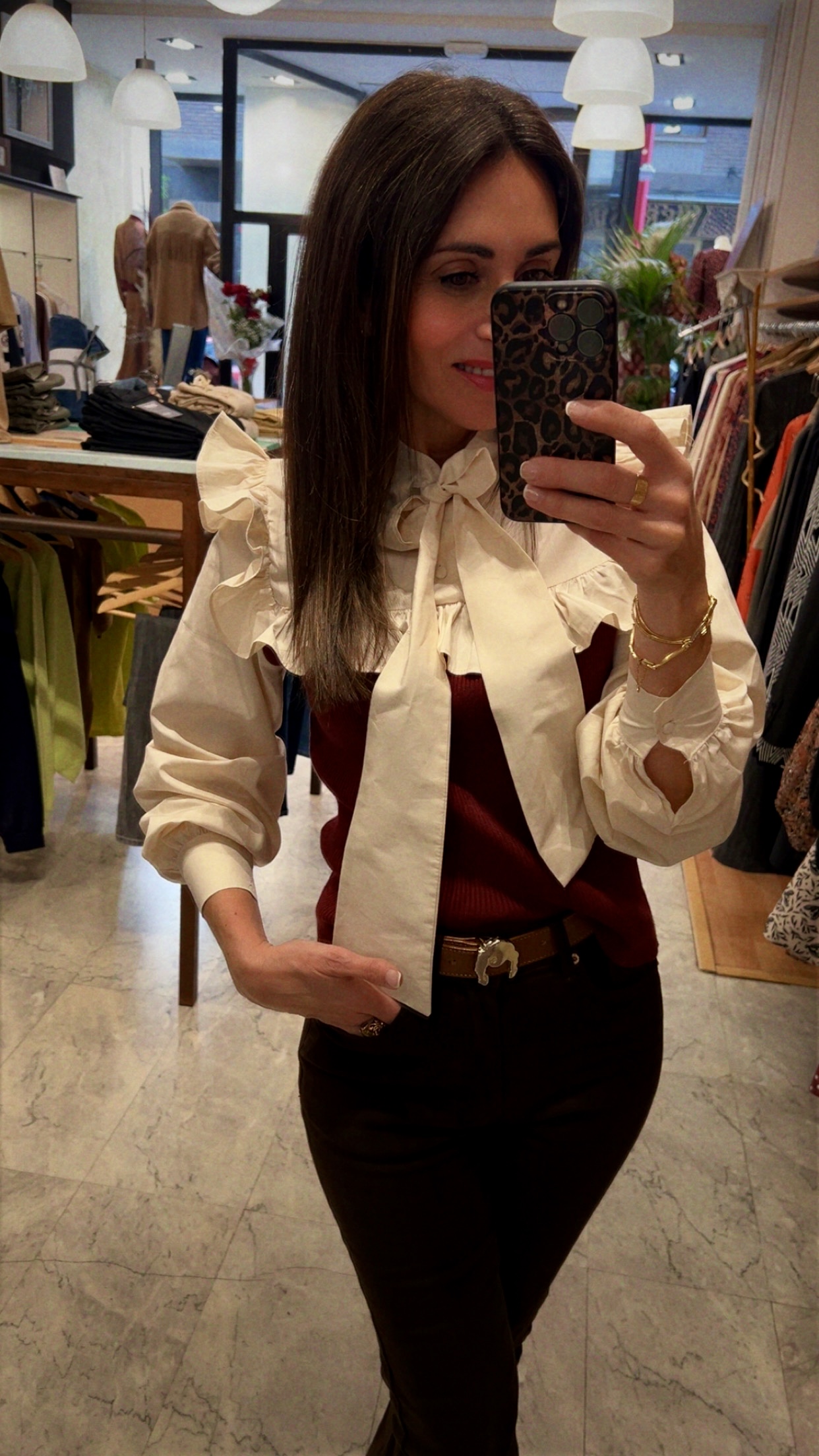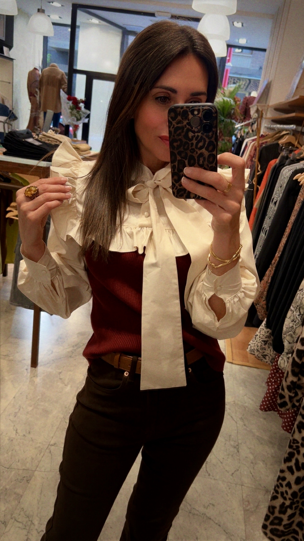 Jersey de punto en tono chocolate combinado en mangas y cuerpo con tejido a modo de camisa con lazada en el cuello y volante. El tejido del punto es canalé fino de textura elástica.