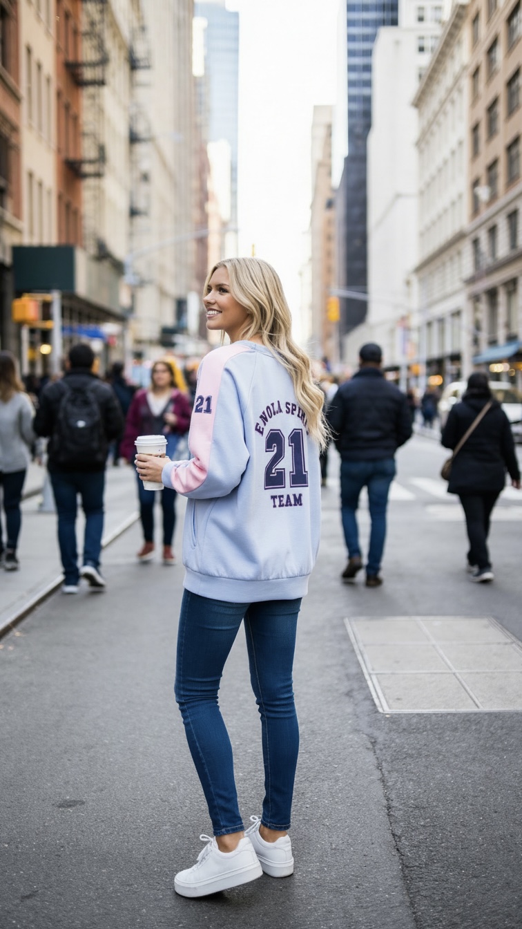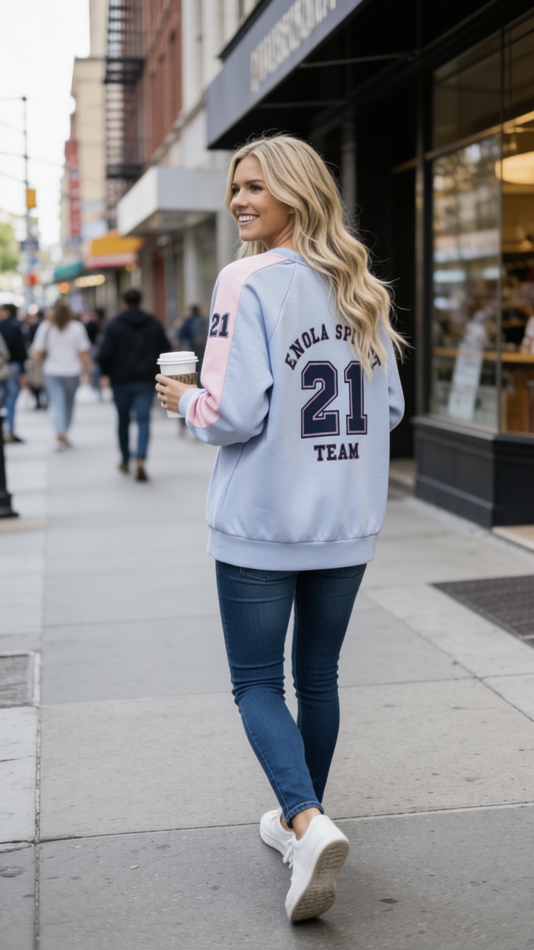 Sudadera de la marca ENOLA en tono azul bebé con escudo bordado en pecho izq. y estampada en ambas partes , con el número 21 en ambas mangas también.