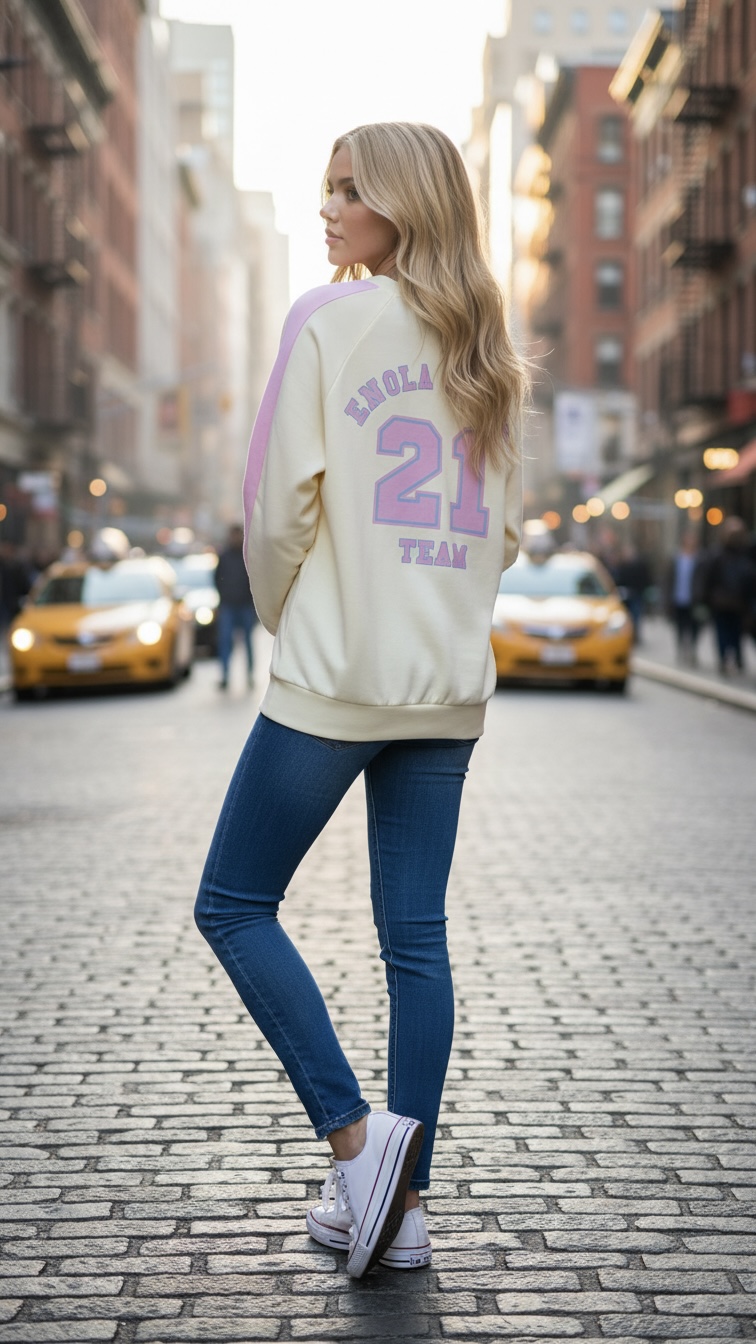 Sudadera de la marca ENOLA en tono amarillo mantequilla con escudo bordado en pecho izq. y estampada en ambas partes , con el número 21 en ambas mangas también.
