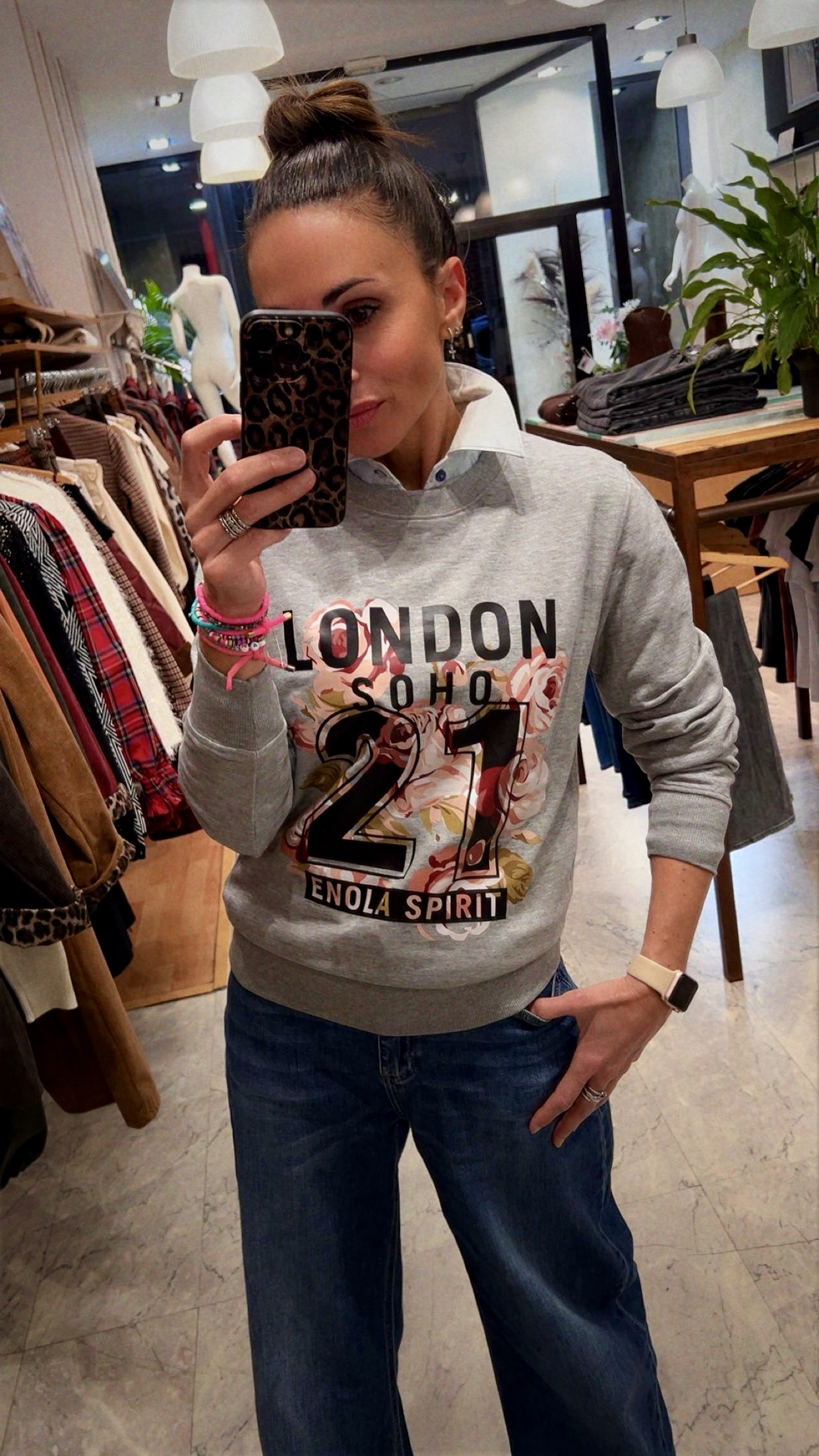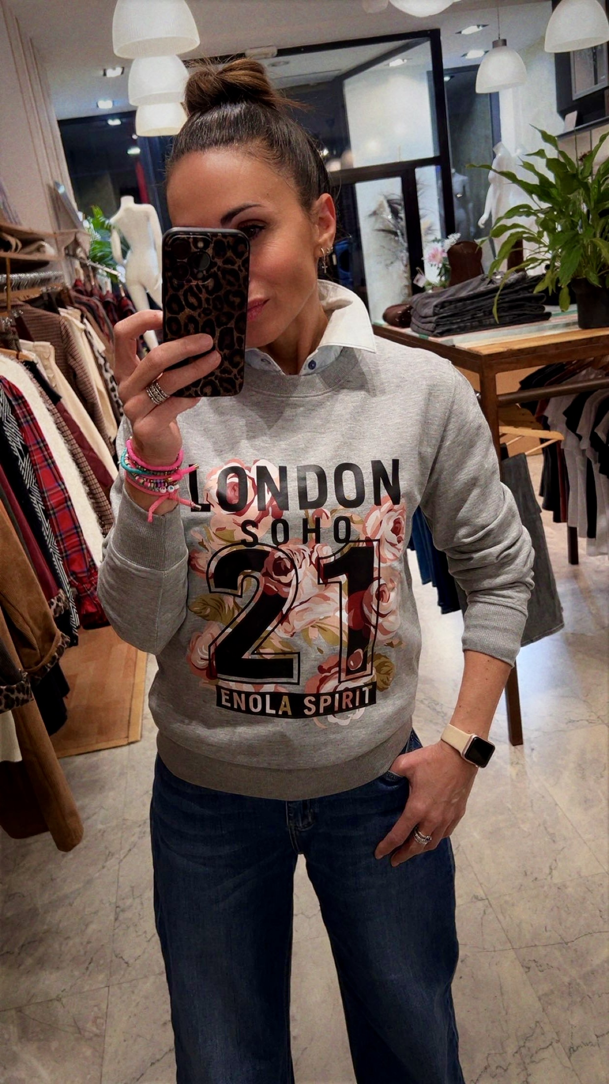 Sudadera London de la marca española ENOLA SPIRIT. Modelo confeccionado en algodón con viscosa , lo que le aporta una caída y suavidad extrema. Por su composición esta prenda no se hace bolitas. Diseñada con estampado exclusivo de la marca.