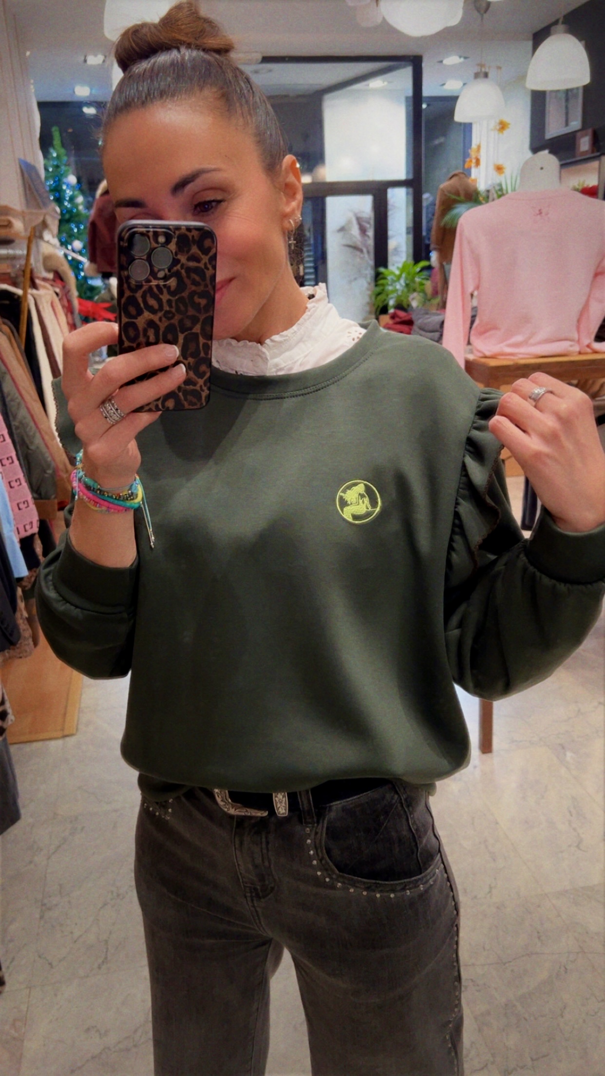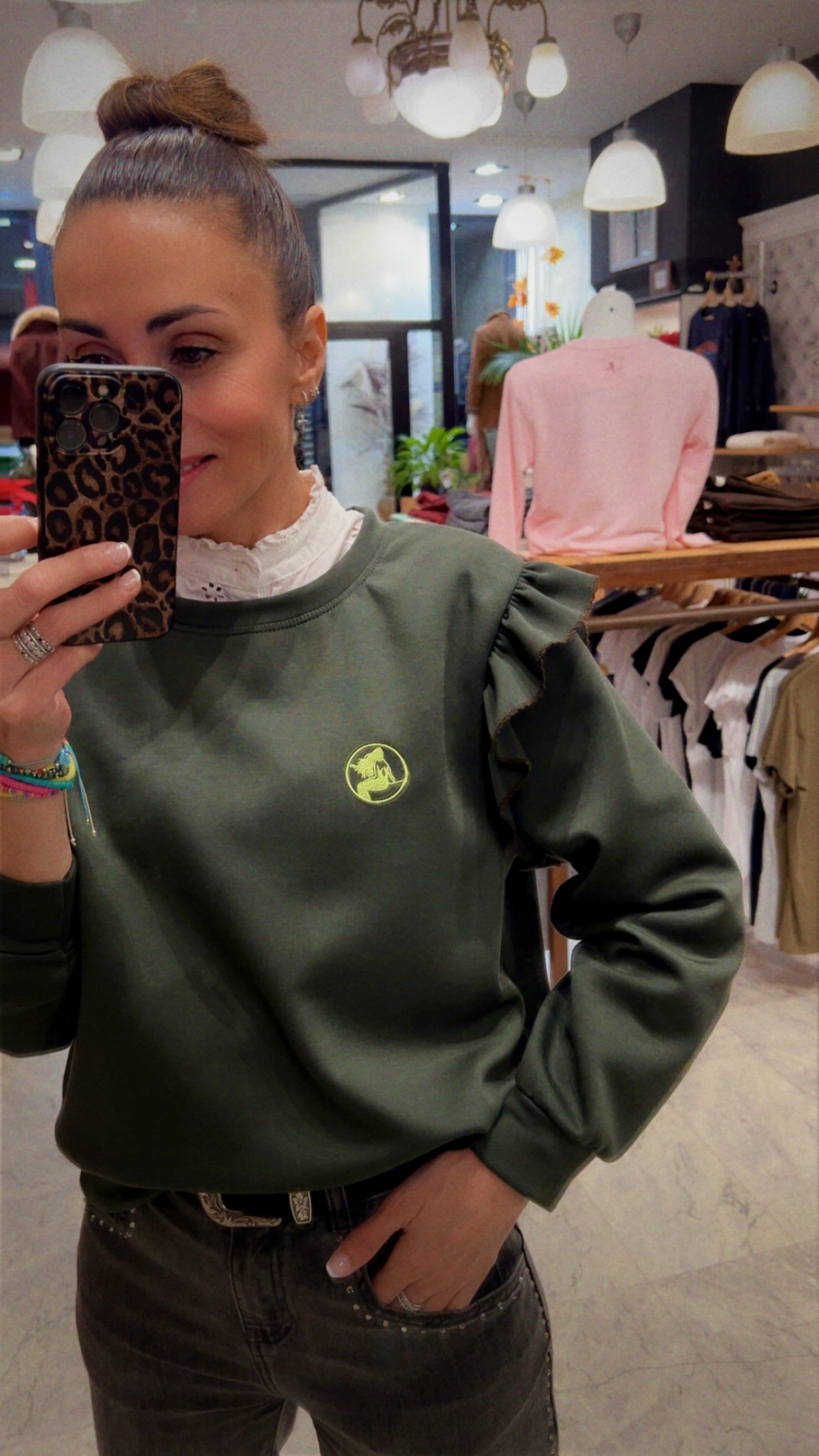 Sudadera de la marca ENOLA en tejido técnico con viscosa de color kaky con bordado de la marca en tono lima. Diseñada con volante en los hombros y ribete bordado.