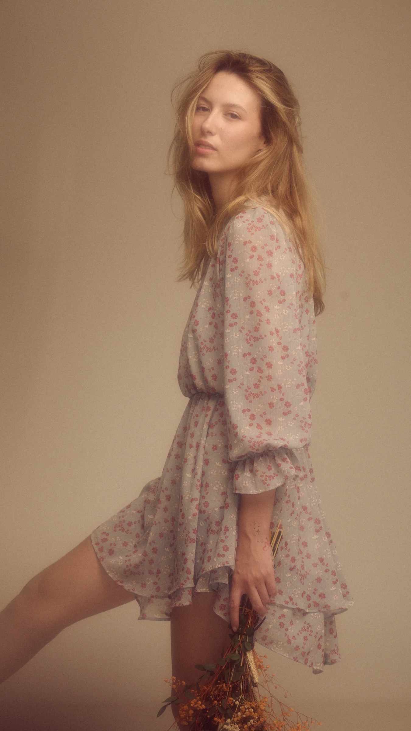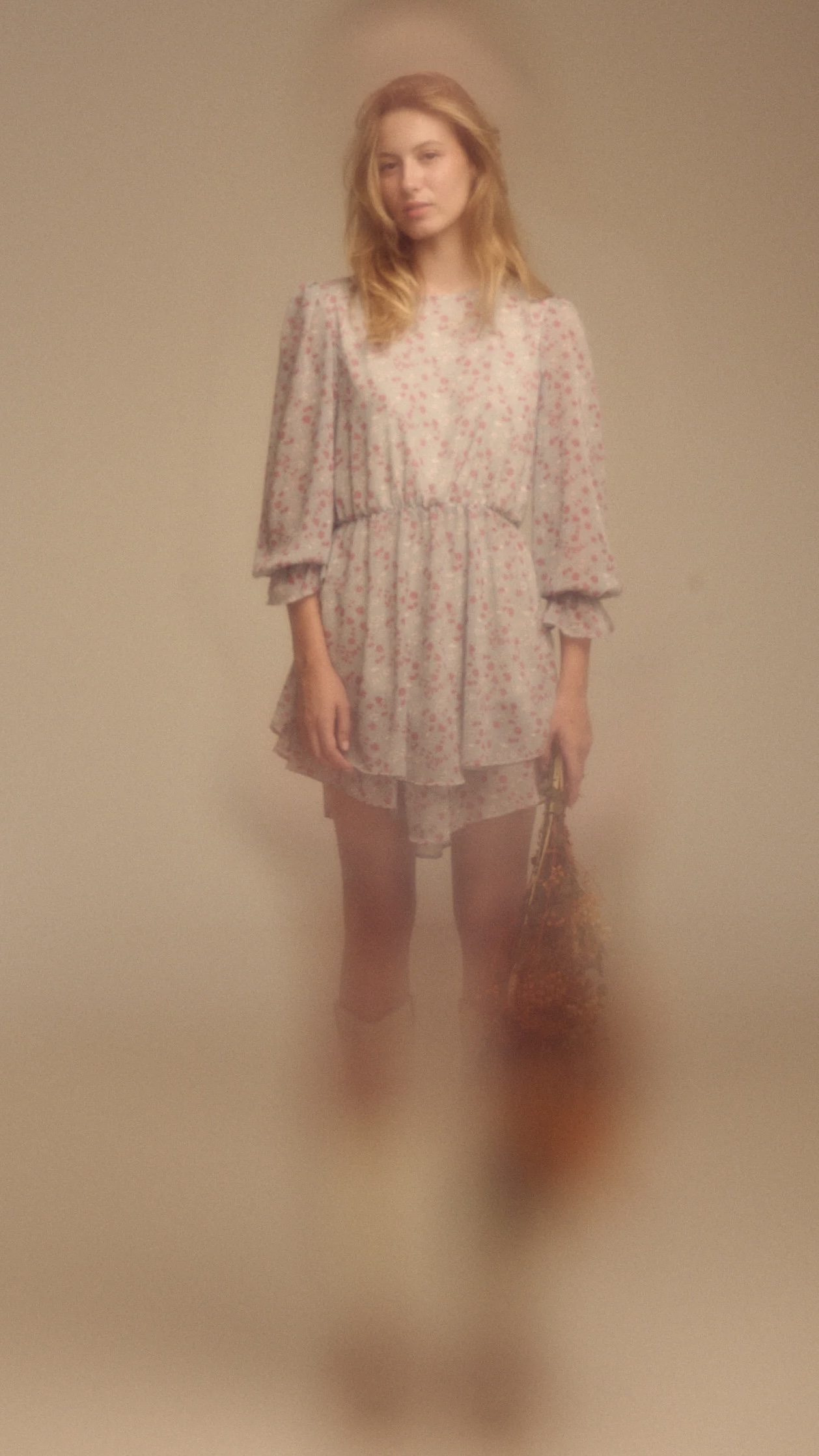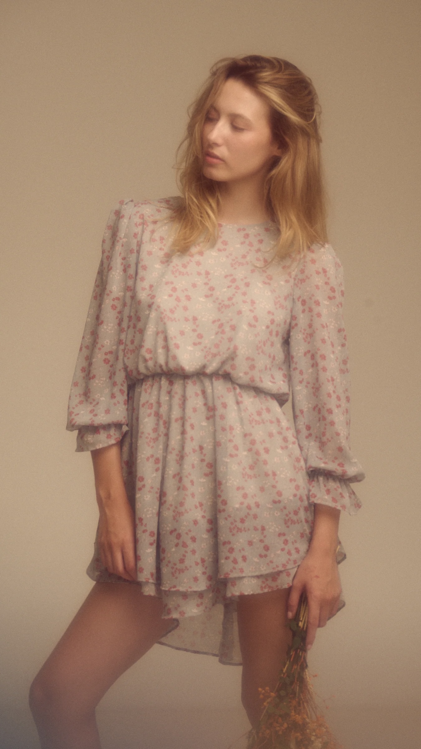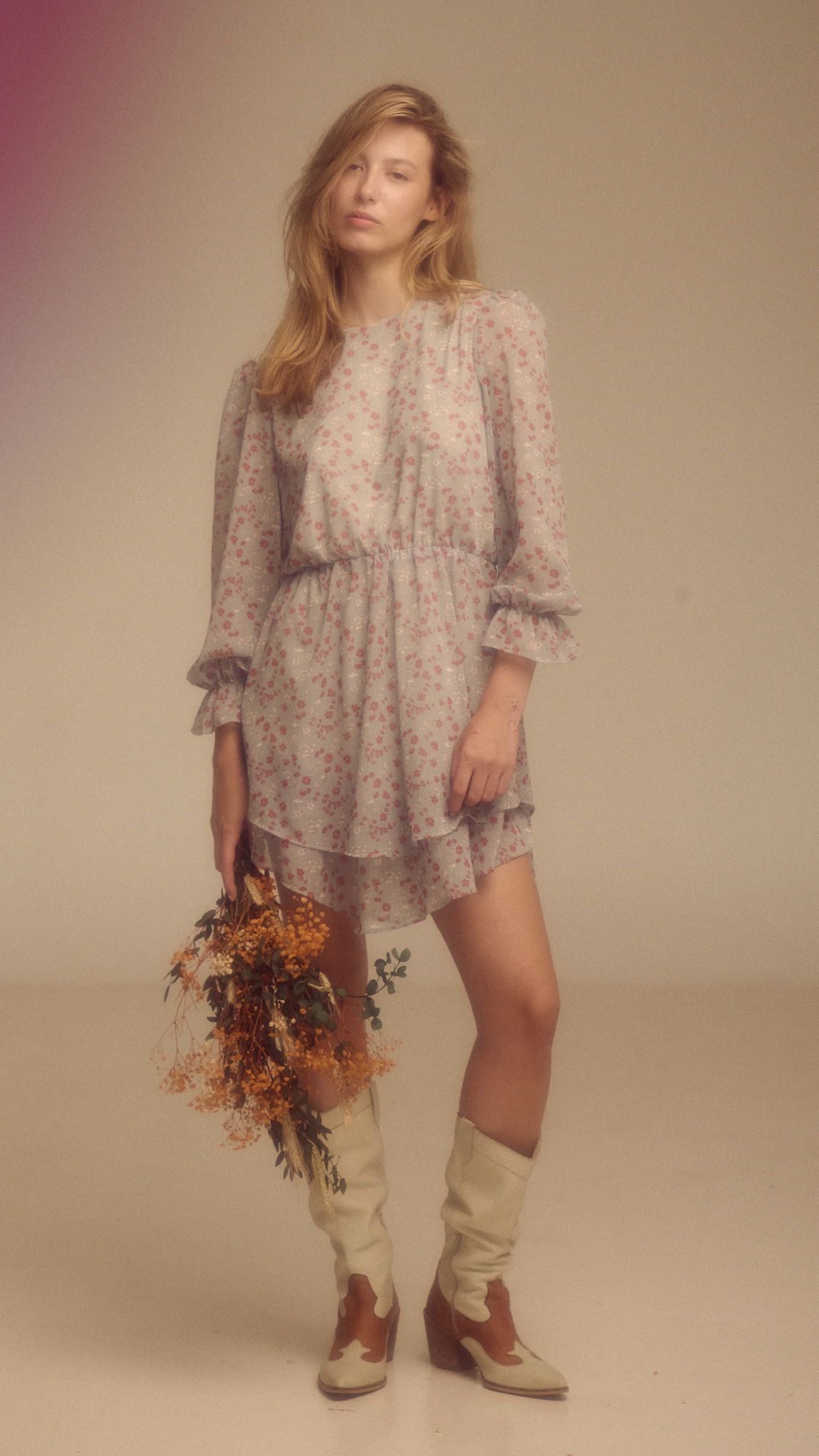 La propuesta perfecta para recibir la nueva temporada, un vestido en georgette con doble falda con mucha capa y fruncido, el cuerpo ablusado y goma en la cintura, las mangas abullonadas con goma en el puño, forrado.