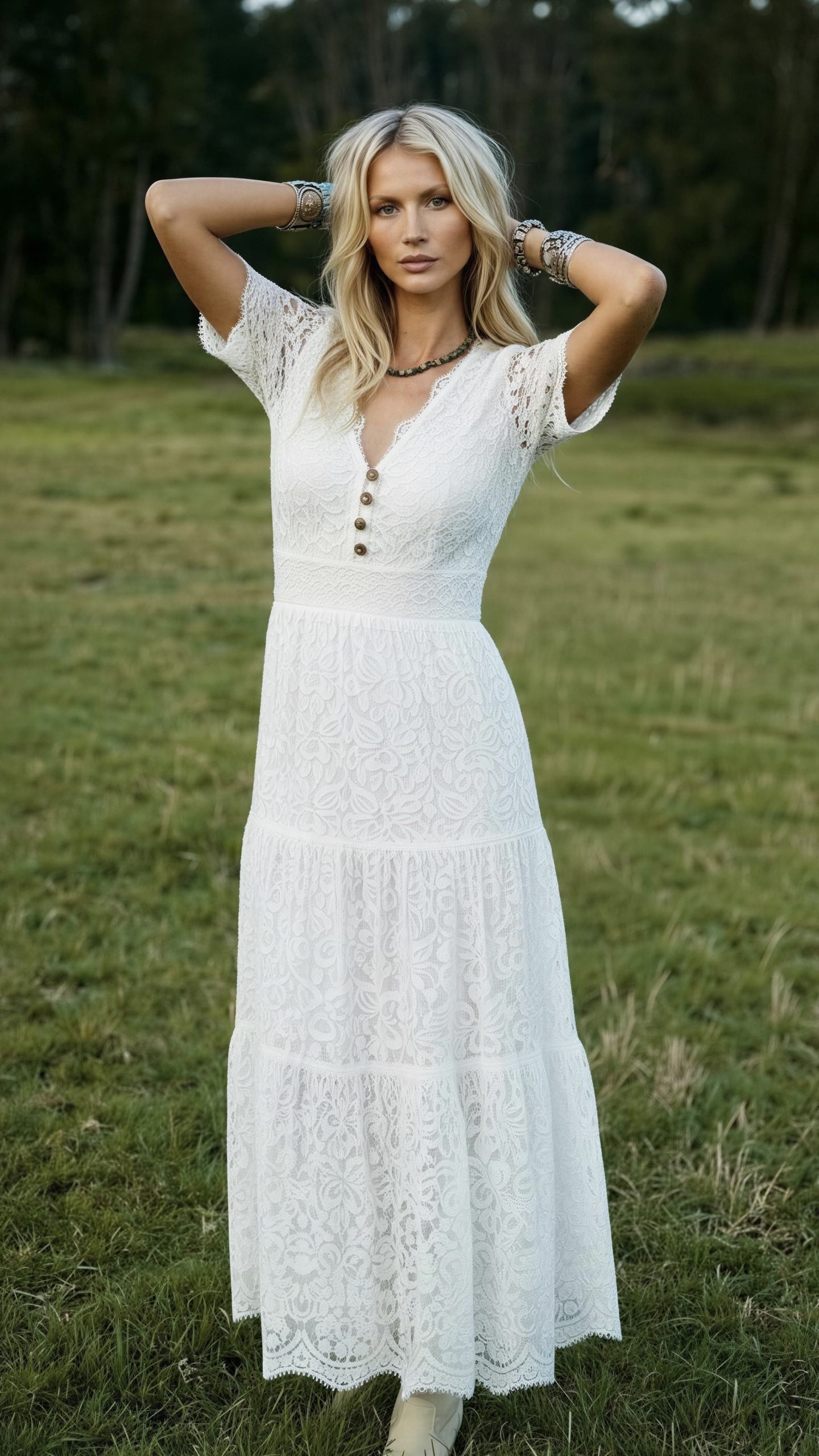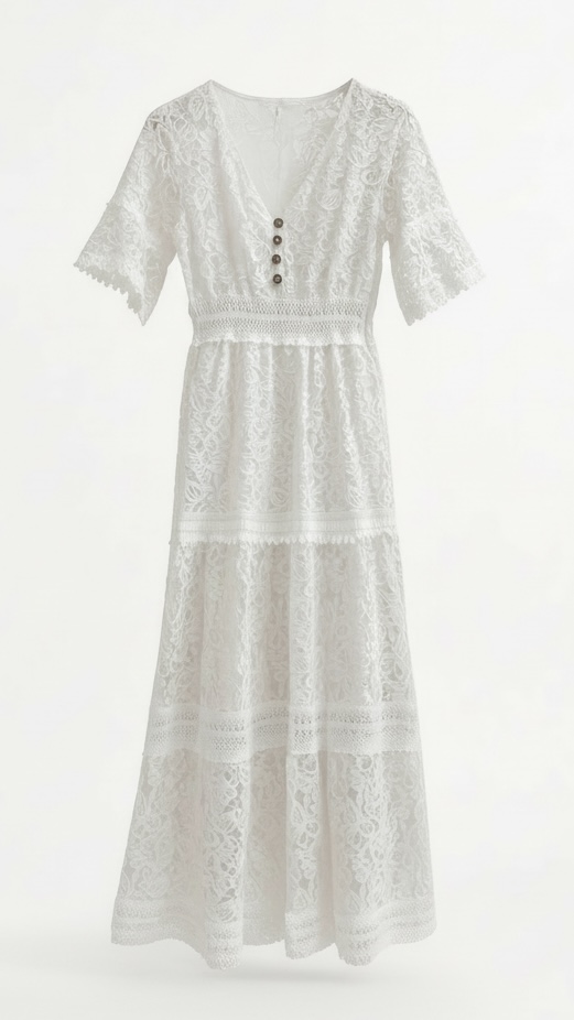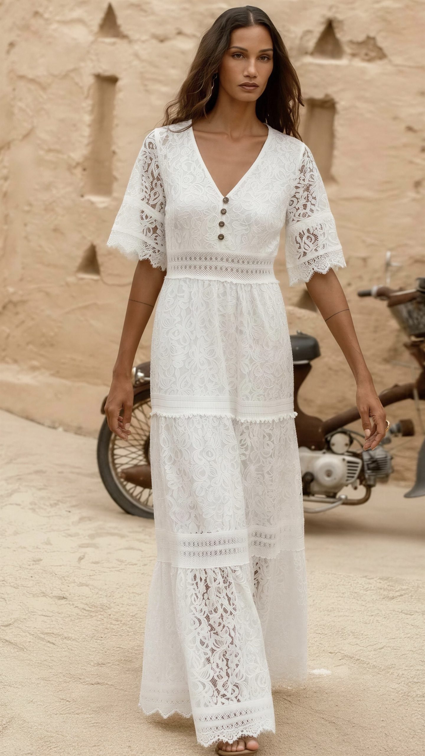 Vestido largo blanco de estilo Ibicenco con manga corta ancha y escote en «V». Confeccionado en encaje elástico blanco con corte en la cintura y falda en pisos. Un autentico » must have » en tu armario de verano.