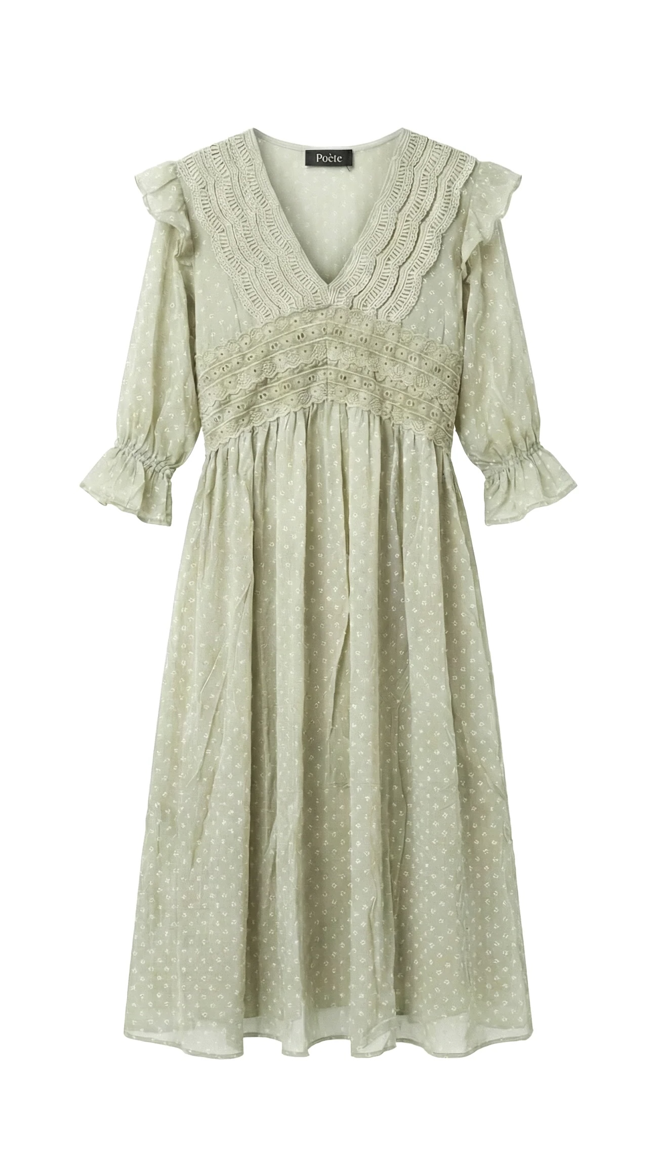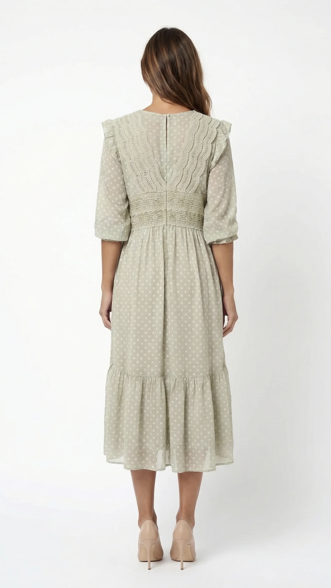 Vestido confeccionado en tejidos combinados de encaje liso, diseñado para ofrecer comodidad y elegancia en cada ocasión. Su tonalidad verde proporciona versatilidad para combinar con diferentes accesorios y prendas.